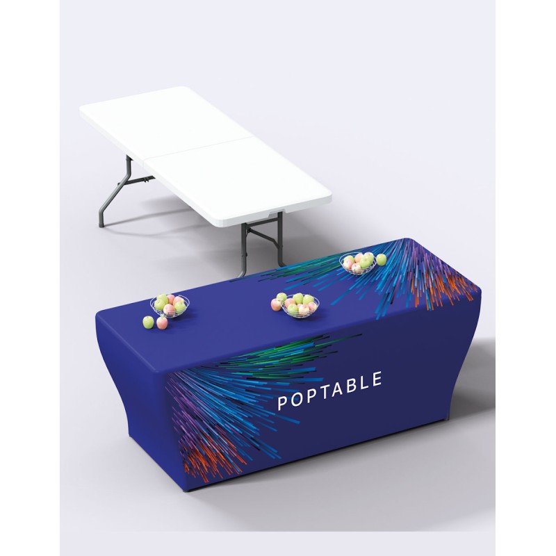 Nos tables pliantes sont constituées de plateaux en polyéthylène HDPE moulés, scindés en 2 pour faciliter le transport et de pieds en acier avec un revêtement grainé pour une meilleure durabilité. Les pieds se déploient avec la gravité et ont un système de verrouillage anti-repli ainsi que des patins en caoutchouc à leurs extrémités. Les tables se replient en quelques secondes et se transportent facilement avec leurs hanses. Capacité de charge : 150kg. Les tables peuvent êtres livrées sans habillage ou avec habillage personnalisé. Lorsqu’elles sont personnalisées, la housse est imprimée dans l’Oise en sublimation numérique allover sur une matière Interlock 280g/m2 très extensible pour épouser au mieux les formes de la table. Des renforts au niveau des pieds sont ajoutés dans l’impression pour garantir la durabilité du print.