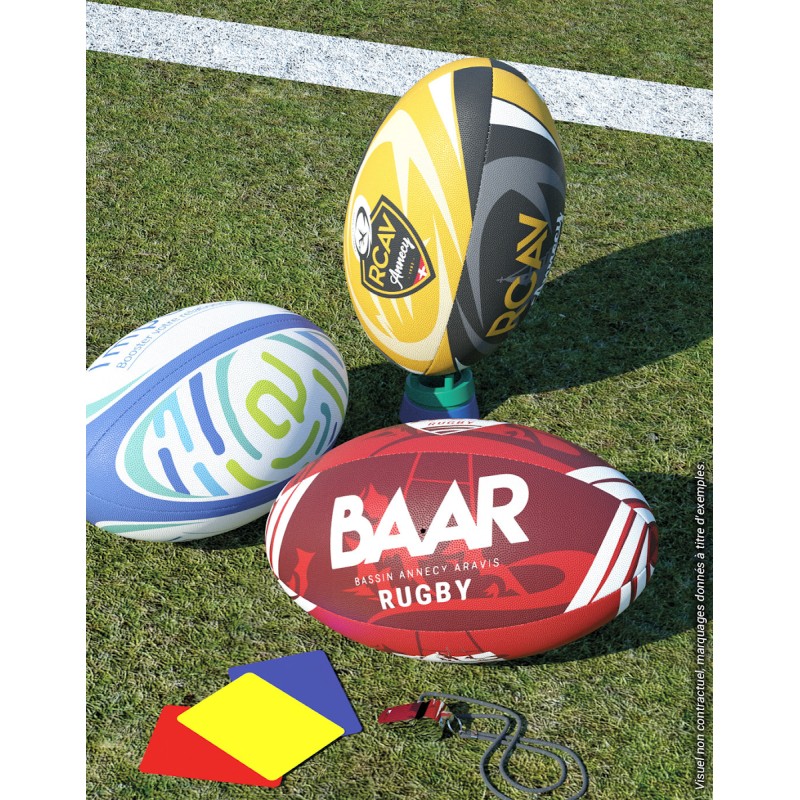 Ballon de rugby Match 100% personnalisé en taille 5 officielle. Revêtement en caoutchouc vulcanisé à picots. Poids officiel : 440g. Revêtement extérieur antiglisse 3 plis pour un maintien de la forme dans le temps. Cousu main 4 panneaux. Vessie latex synthéthique. Personnalisation intégrale en sérigraphie (6 couleurs maximum). Idéal pour les terrains d’entrainement et la compétition. Ballon livré non gonflé sous polybag individuel. Aiguille en option. Minimum de commande : 50 pcs