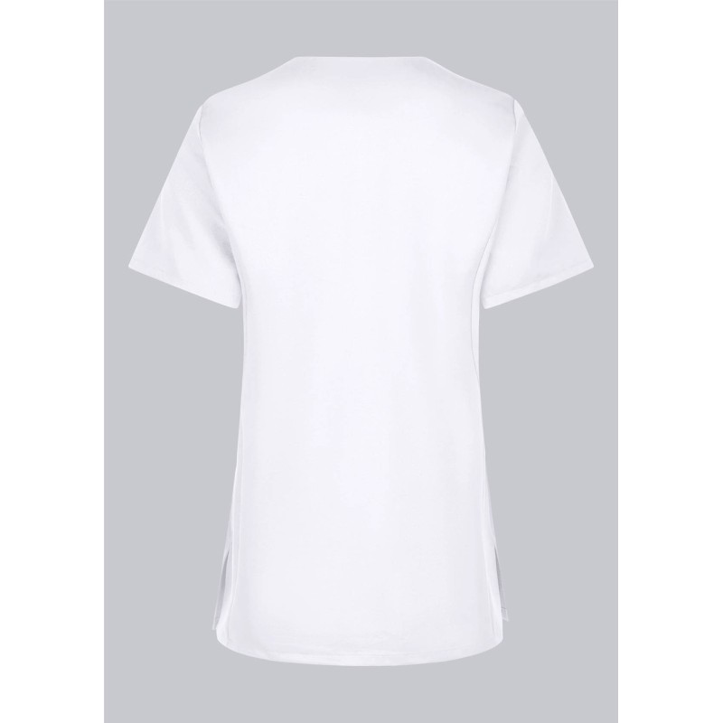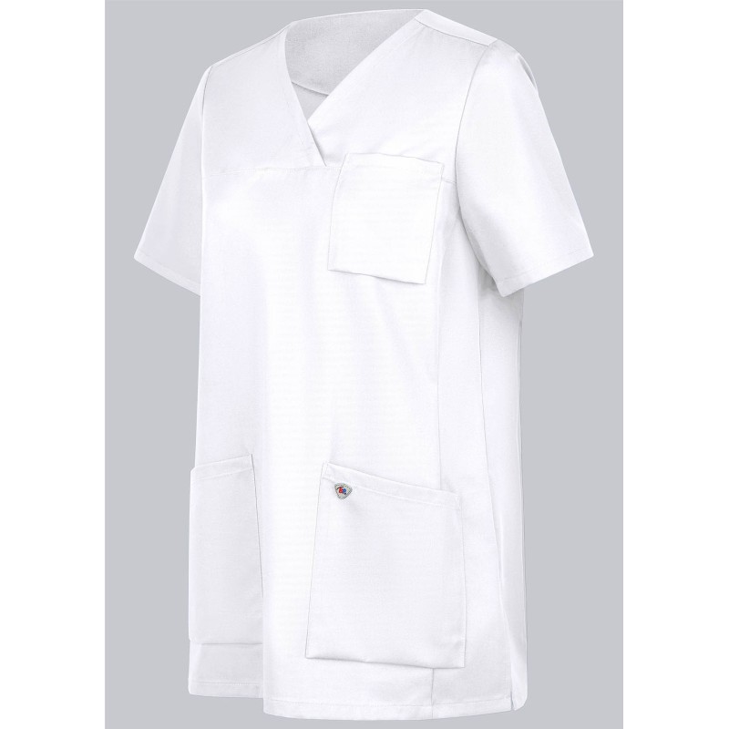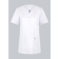 Manches 1/2, encolure en V croisé, 1 poche poitrine, 2 poches latérales, fentes de côté.