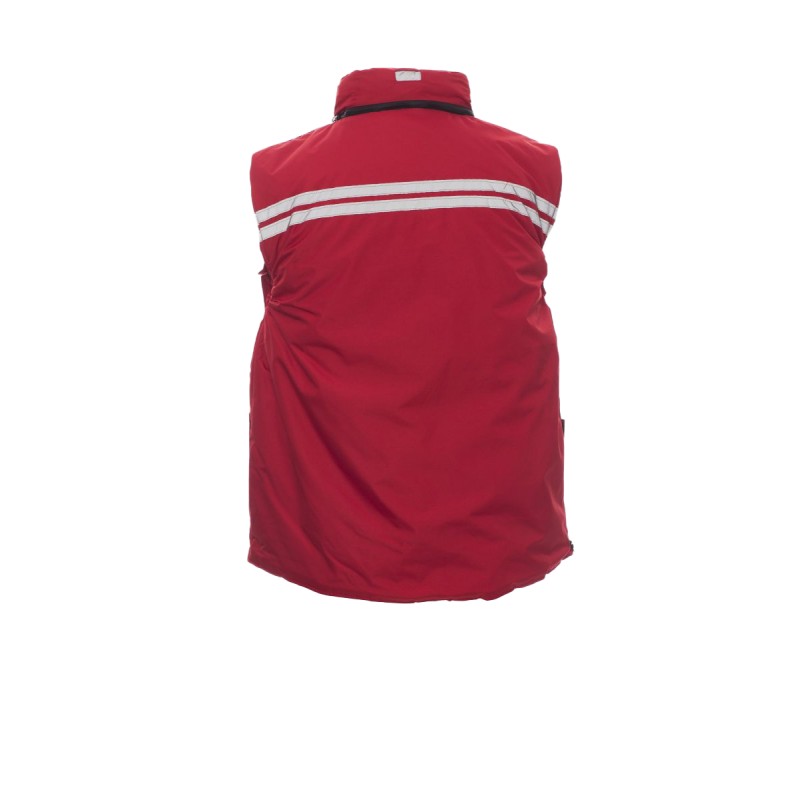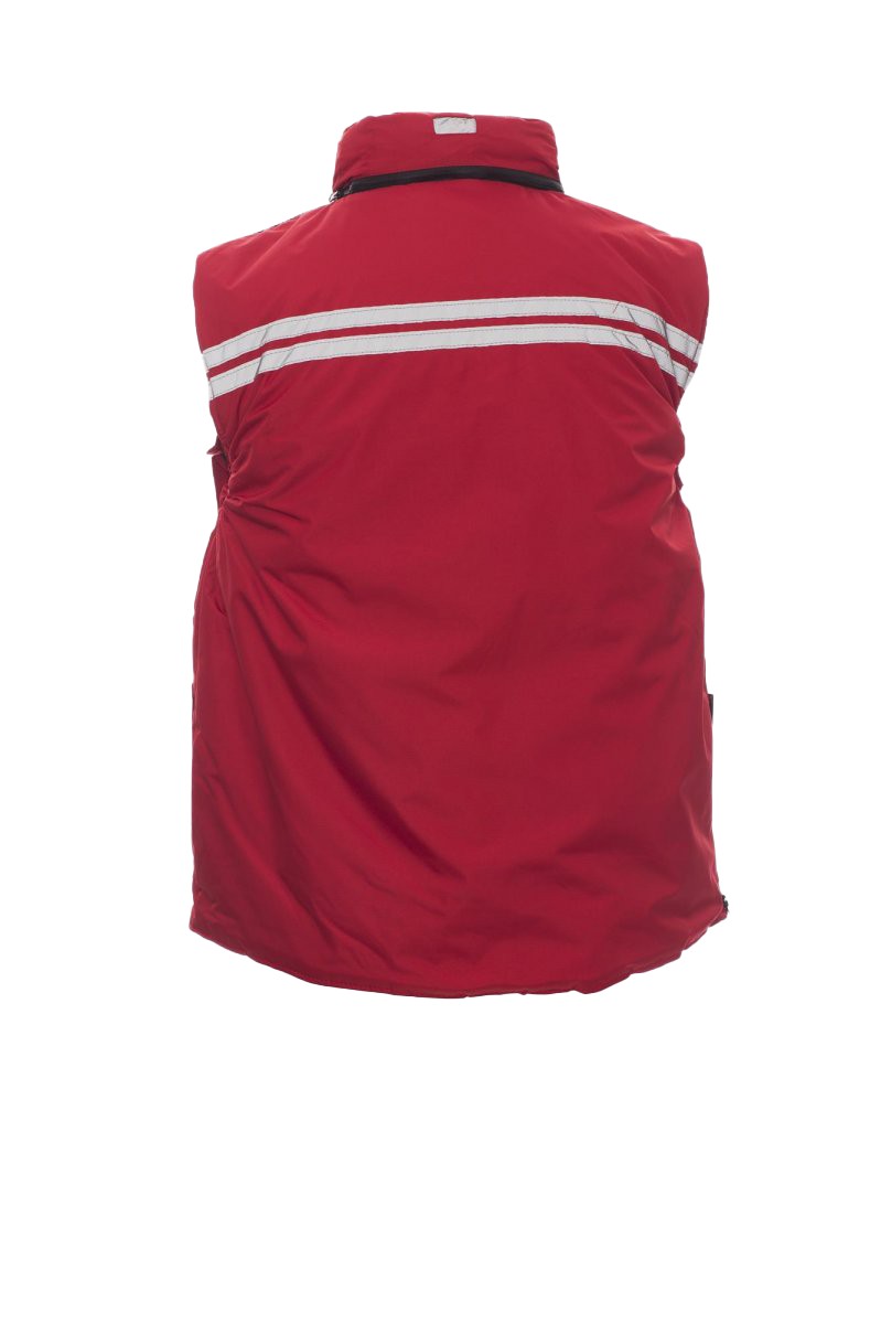 Gilet homme, à zip de 8 mm en plastique avec curseur en métal, rabat et boutons en plastique, capuche profilée détachable et/ou repliable dans le col, passepoils réfléchissants gris devant et derrière, fente latérale à soufflet et zip, neuf poches extérieures dont deux LOCK SYSTEM, deux zippées et intérieur renforcé, une avec porte-badge réversible. Intérieur : rembourré, col, dos et chauffe-reins en micropolaire, coulisse à la taille et fermeture éclair intérieure pour faciliter impressions et broderies.