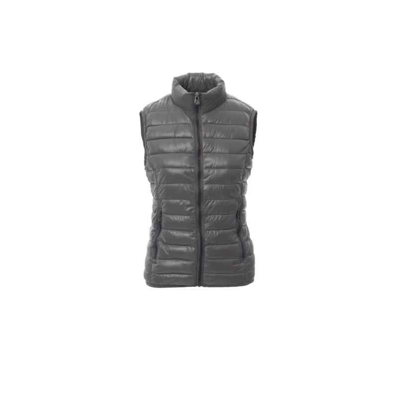Gilet/doudoune femme, coupe ergonomique, à zip de 8 mm en plastique avec curseur en métal, fin liseré à la taille, deux poches extérieures. Intérieur : rembourrage polyester effet duvet, trois poches.