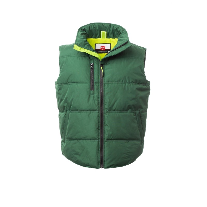 Gilet unisexe à fermeture éclair de 8 mm en plastique avec curseur en métal, deux poches latérales à fermeture éclair, une poche de poitrine. Intérieur: matelassé et en micropolaire à contraste.