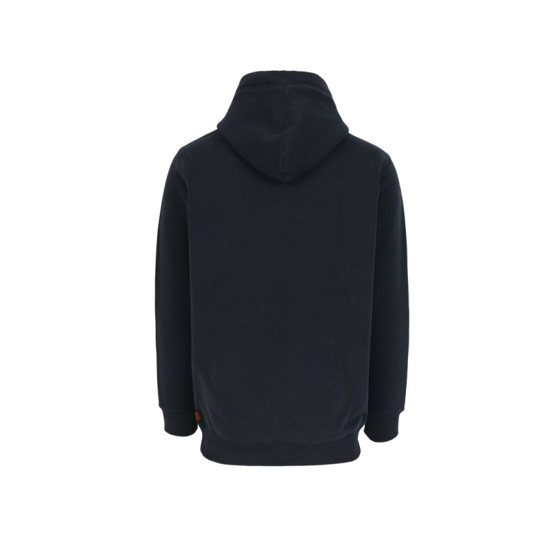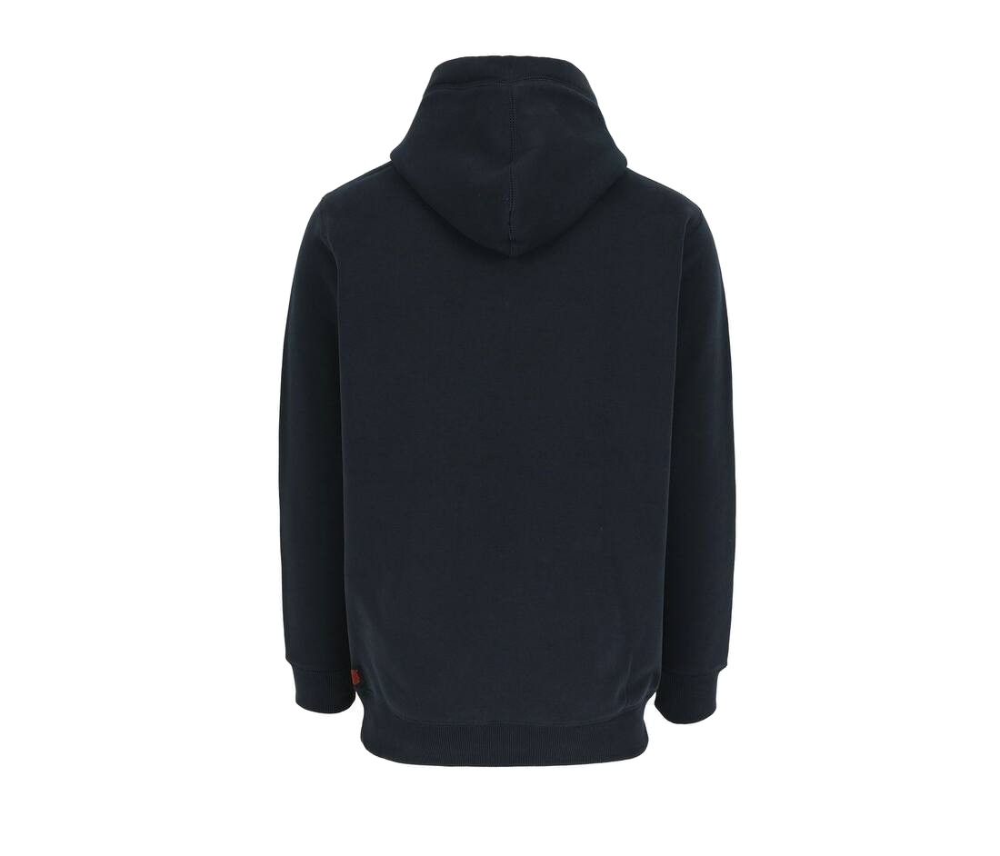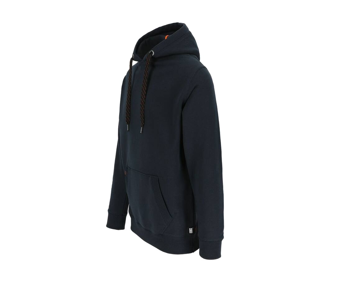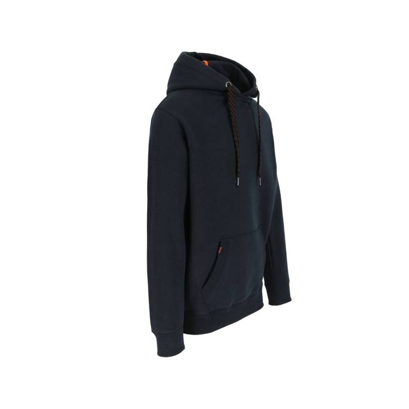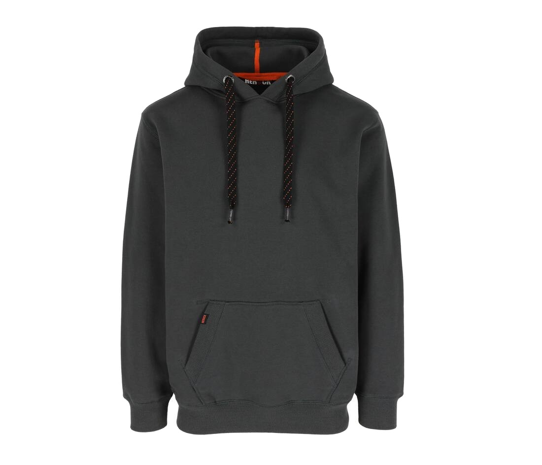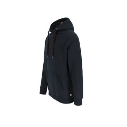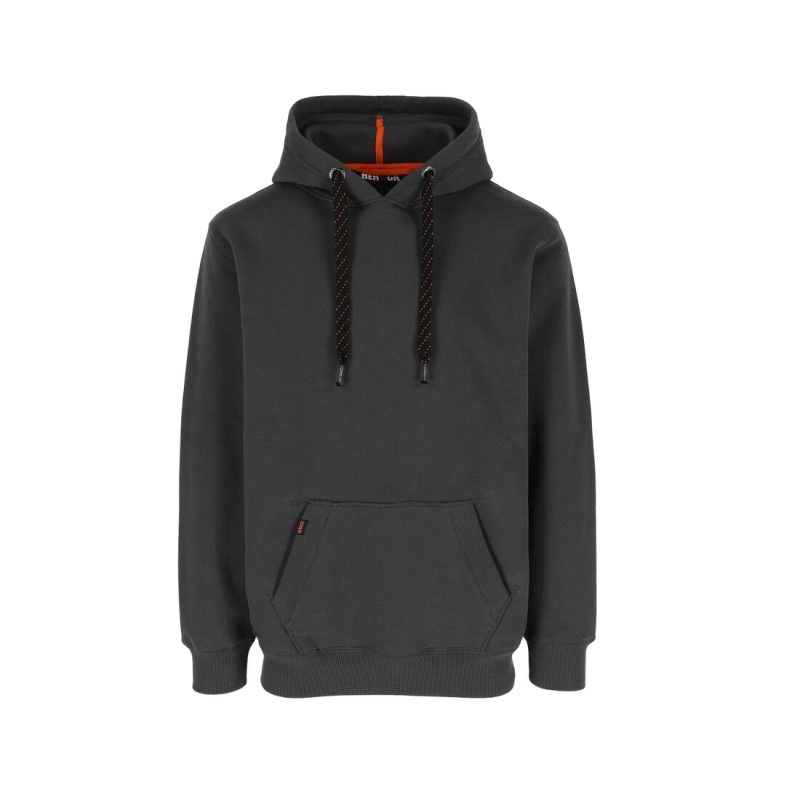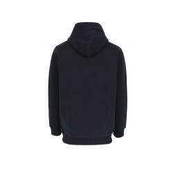 Poche kangourou. Poignets et taille en bord côte. Capuche avec gros cordon de serrage.