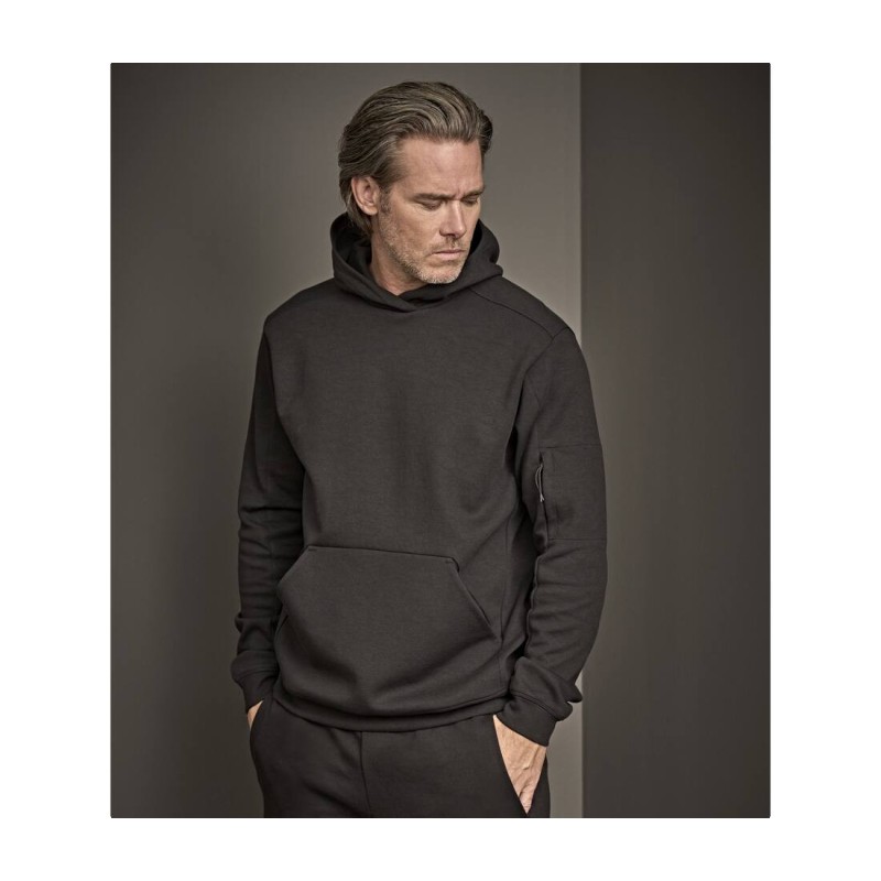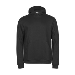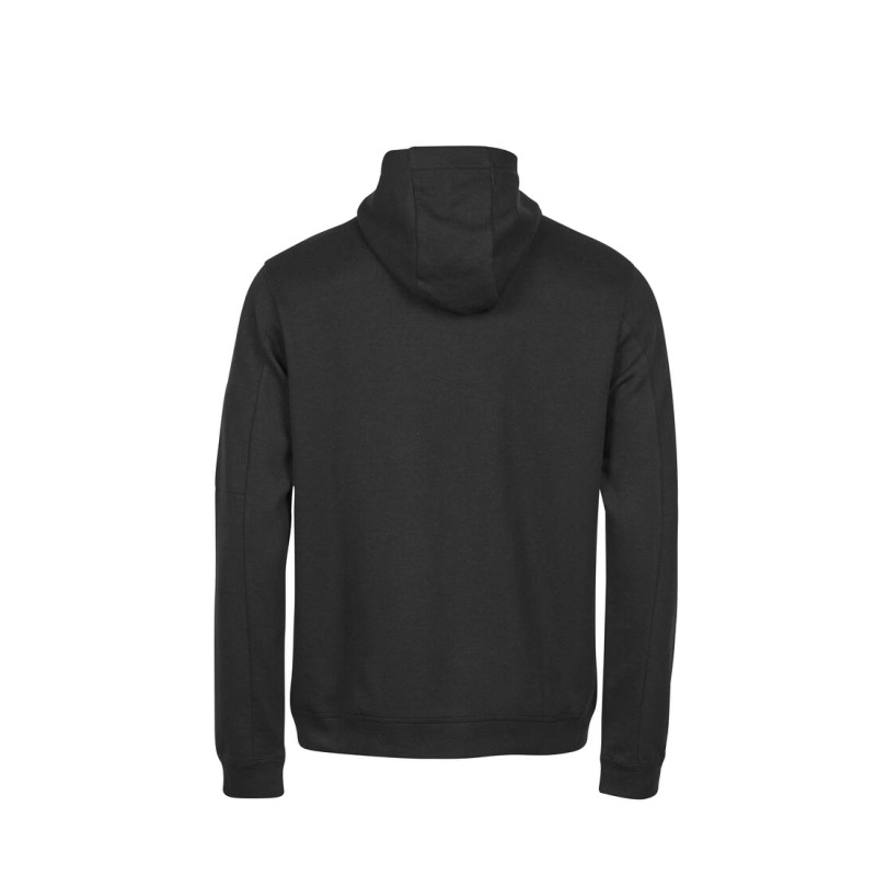 Capuche doublée. Grande poche kangourou. Poche zippée sur la manche.
