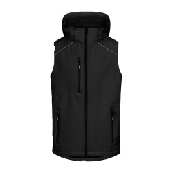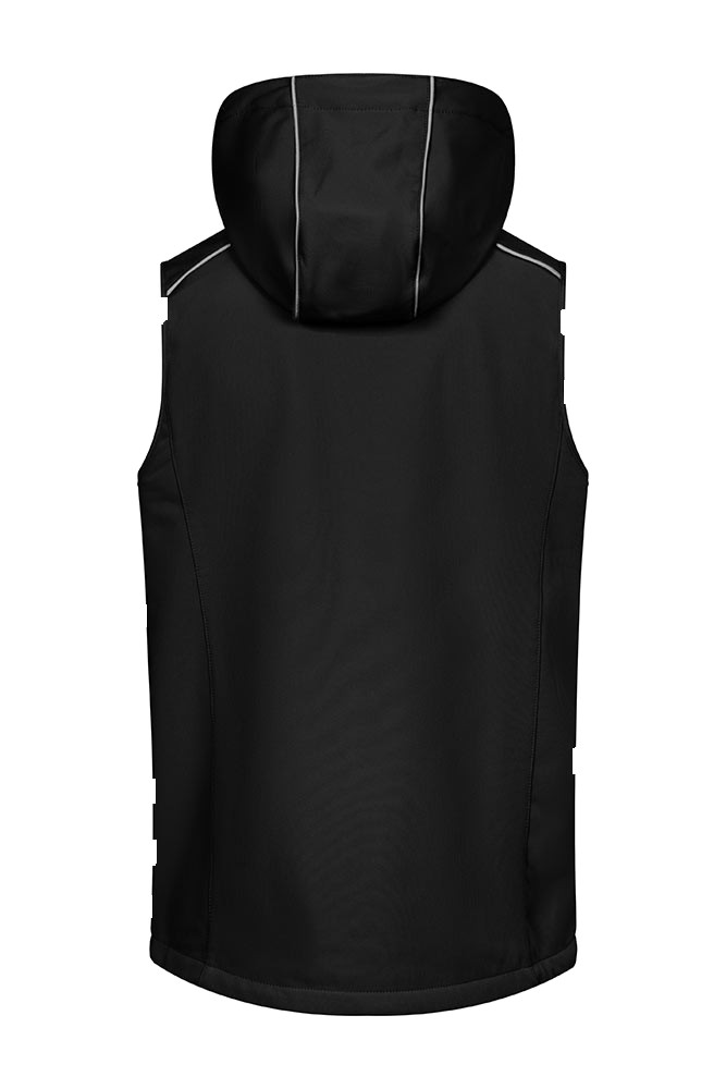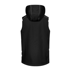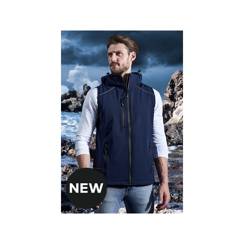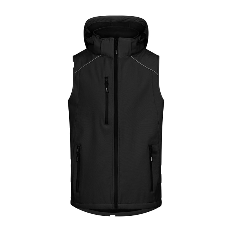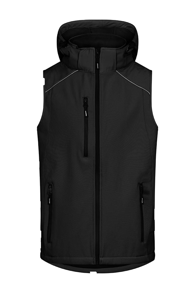 Gilet Softshell pour homme, capuche amovible avec régulateur de volume, fermetures éclair étanches, protection du menton, poche Napoléon, cordon de serrage tunnel au bas avec stop-cordons à l'intérieur, dos plus long avec ourlet incurvé, 2 poches latérales zippées, porte-clés cousu dans la poche latérale, passepoil réfléchissant et tirettes de fermeture éclair, coutures des panneaux, étiquette de taille neutre, respirant, imperméable 8 000 mm, polaire softshell collée bi-élastique, matériau extérieur 95 % polyester, 5 % élasthanne, matériau intérieur 100 % polyester, 310 g/m², S–5XL. Unité = 1 pièce.
