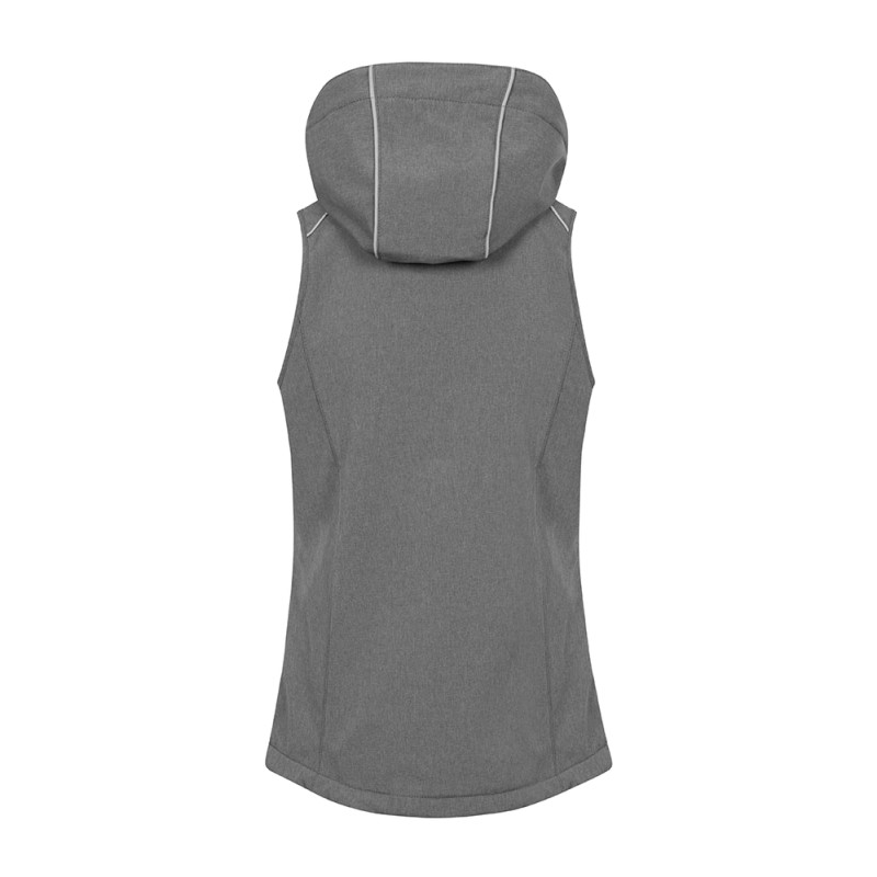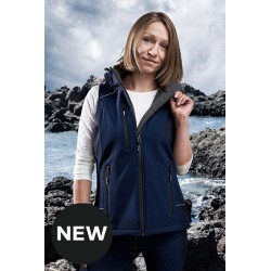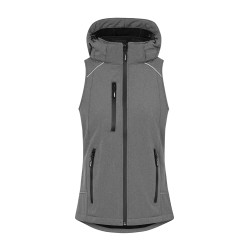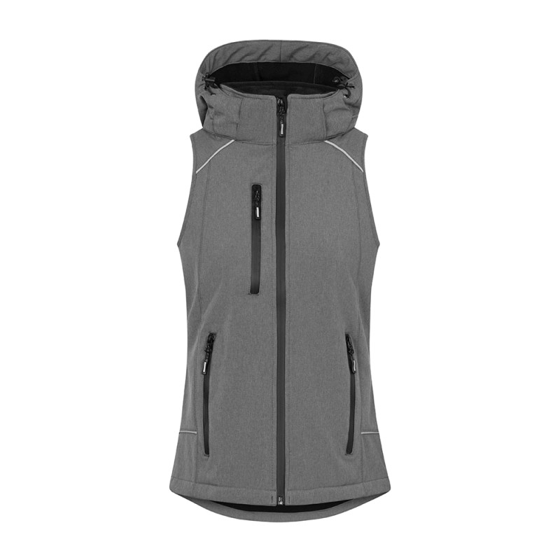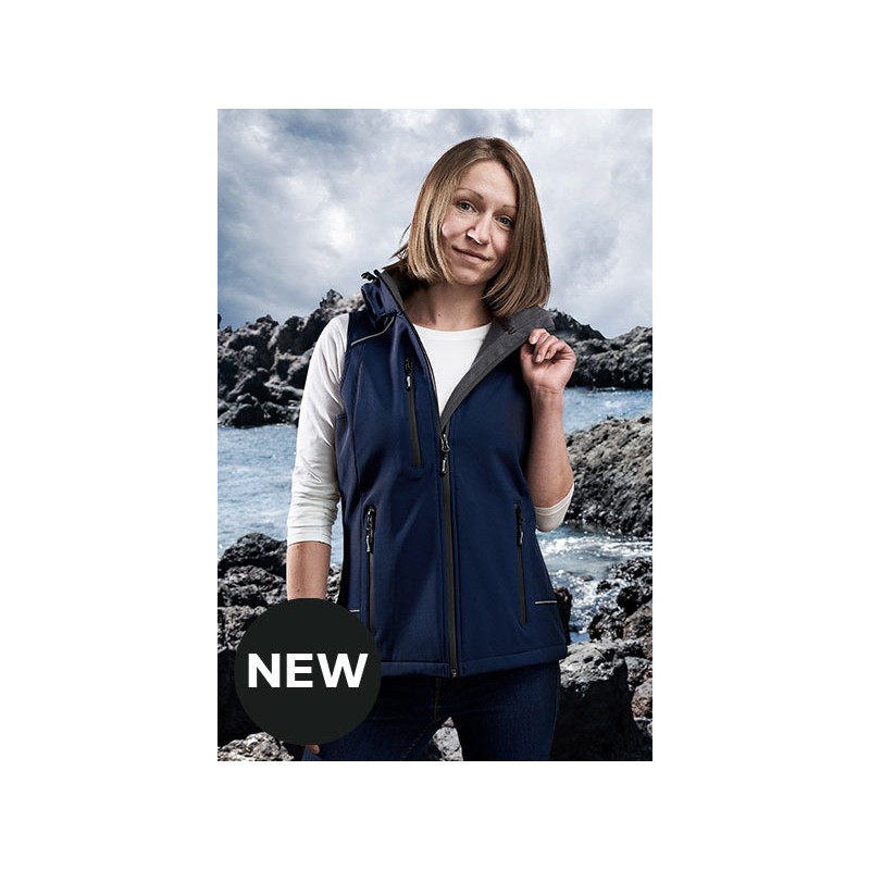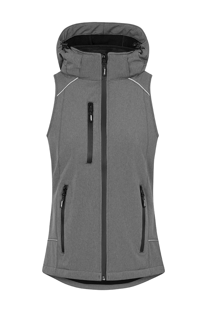 Gilet Softshell femme Weste, capuche amovible avec régulateur de volume, fermetures éclair étanches, protection du menton, poche Napoléon, cordon de serrage tunnel au bas avec stop-cordons à l'intérieur, dos plus long avec ourlet incurvé, 2 poches latérales zippées, porte-clés cousu dans la poche latérale, passepoil réfléchissant et tirettes de zip, coutures de panneaux, étiquette de taille neutre, respirant, imperméable 8 000 mm, polaire softshell contrecollée bi-élastique, matériau extérieur : 95 % polyester, 5 % élasthanne, matériau intérieur : 100 % polyester, 310 g/m², unité S–XXXL = 1 pièce.