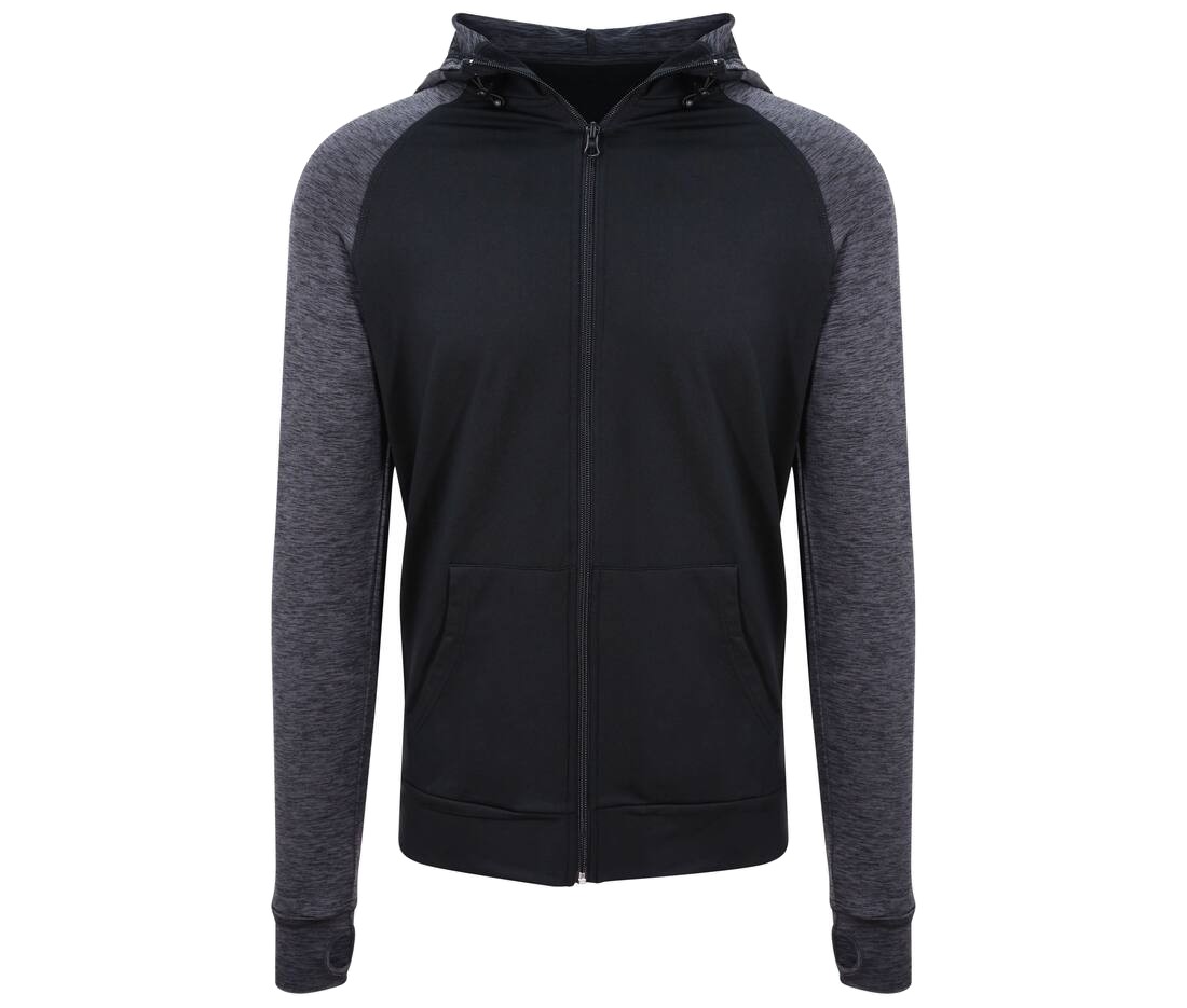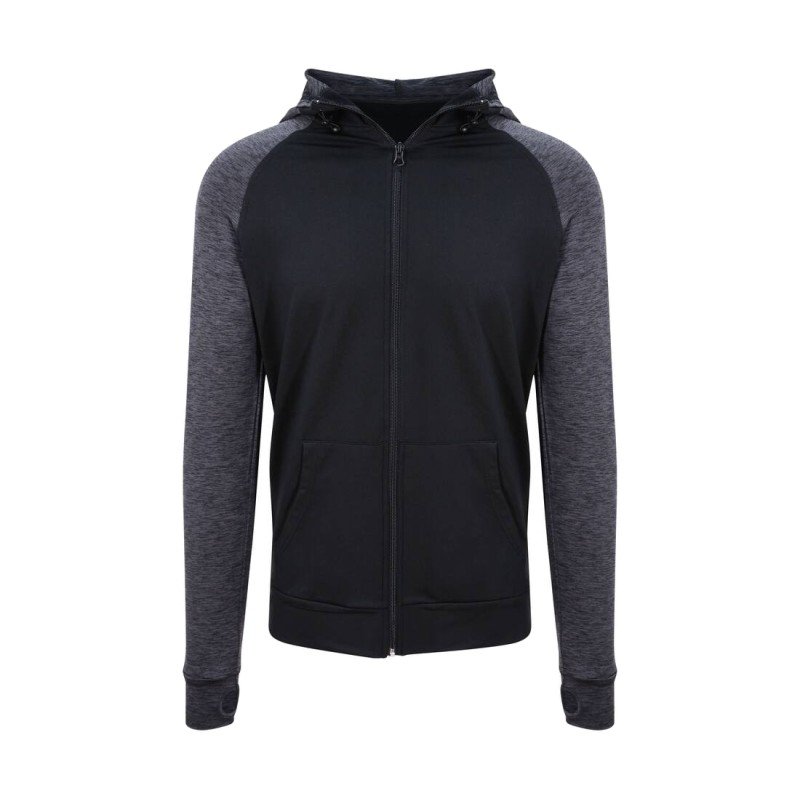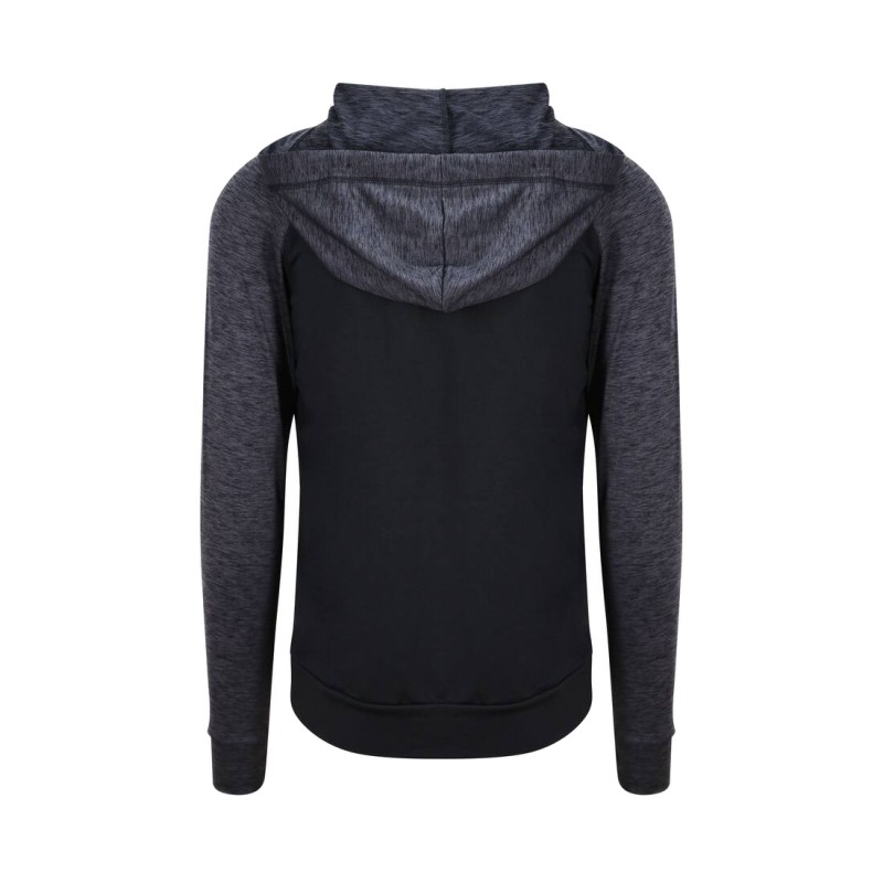 Manches raglan et contrastées. Poche kangourou. Fermeture grand zip. Séchage rapide.