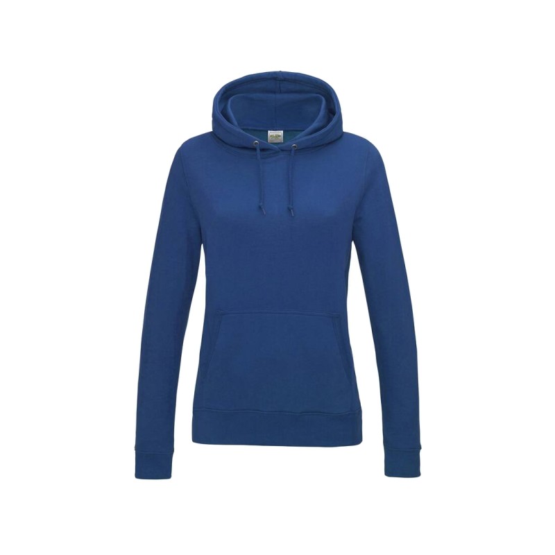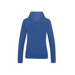 Coupe féminine. Capuche doublée. Cordons ton sur ton. Poche kangourou.