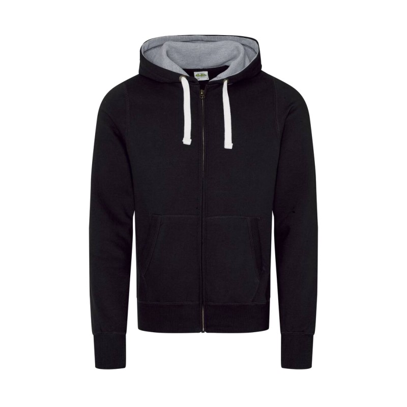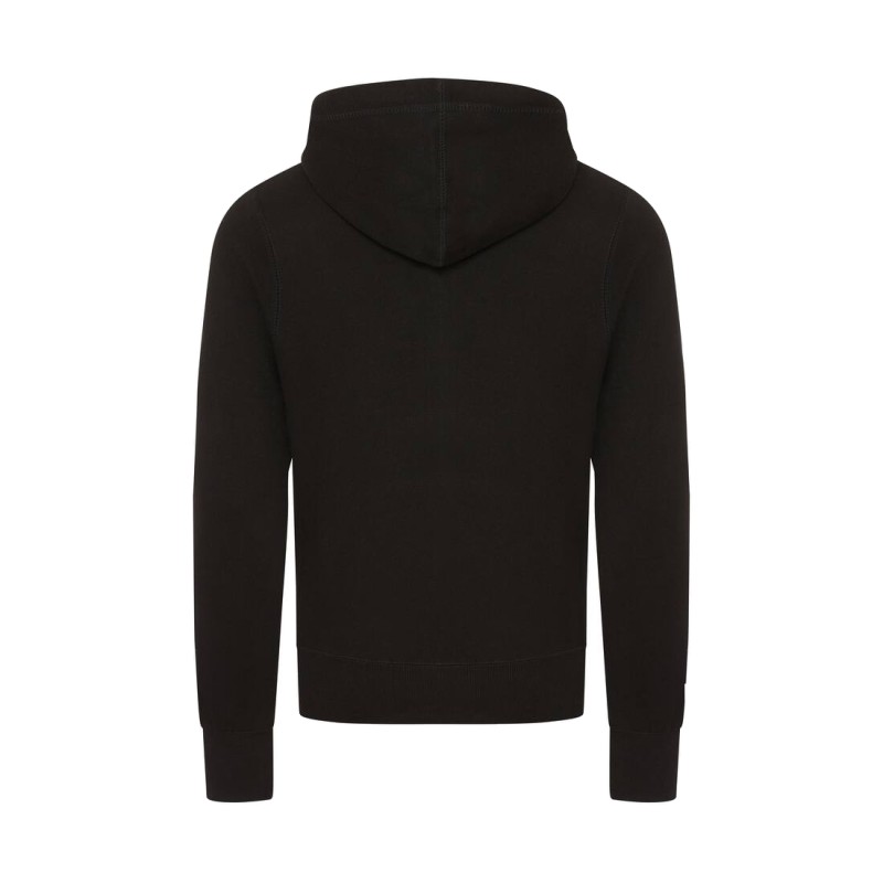 Fermeture grand zip recouverte par un bord côte. Capuche doublée par un tissu gaufré heather grey. Poches kangourou. Épais cordons blancs.