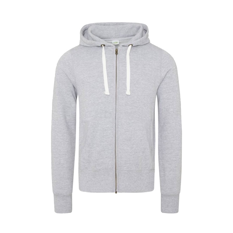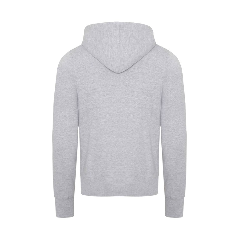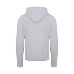 Fermeture grand zip recouverte par un bord côte. Capuche doublée par un tissu gaufré heather grey. Poches kangourou. Épais cordons blancs.