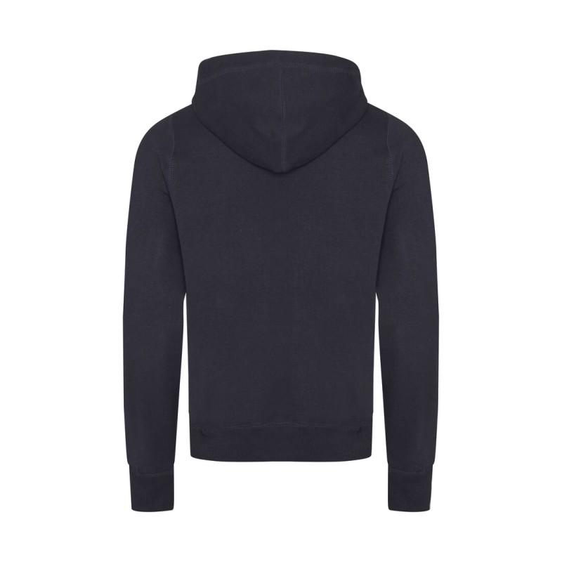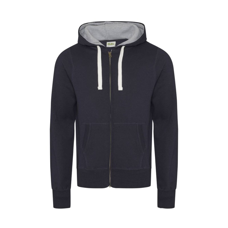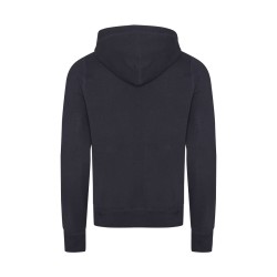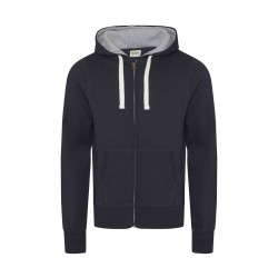 Fermeture grand zip recouverte par un bord côte. Capuche doublée par un tissu gaufré heather grey. Poches kangourou. Épais cordons blancs.
