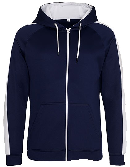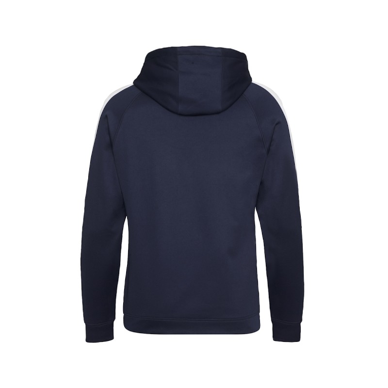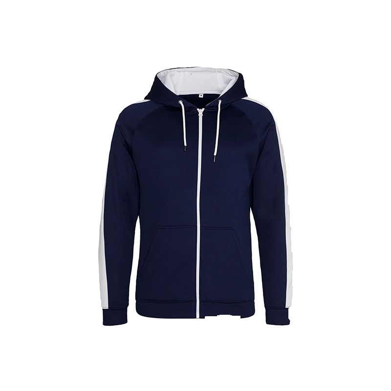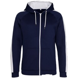 Fermeture éclair en plastique contrastée. Manches raglan avec panneau contrasté. Capuche trois panneaux avec intérieur contrasté. Intérieur brossé.