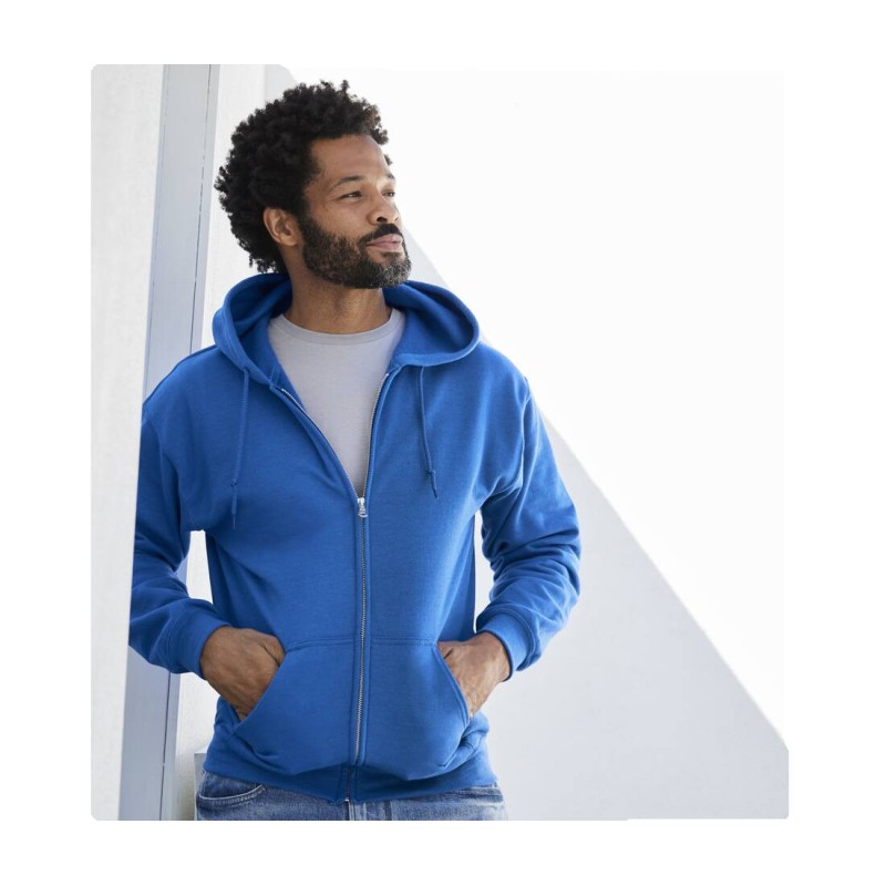 50% coton  / 50% polyester. Molleton interieur gratté pré-rétreci. Fil "Air-Jet" pour une surface plus douce et anti-boulochage. Manches droites. Capuche non doublée avec cordons de couleur assortie. Zip métallique YKK® recouvert pour permettre l'impression sur tout le devant. Poches kangourou. Coupe classique.