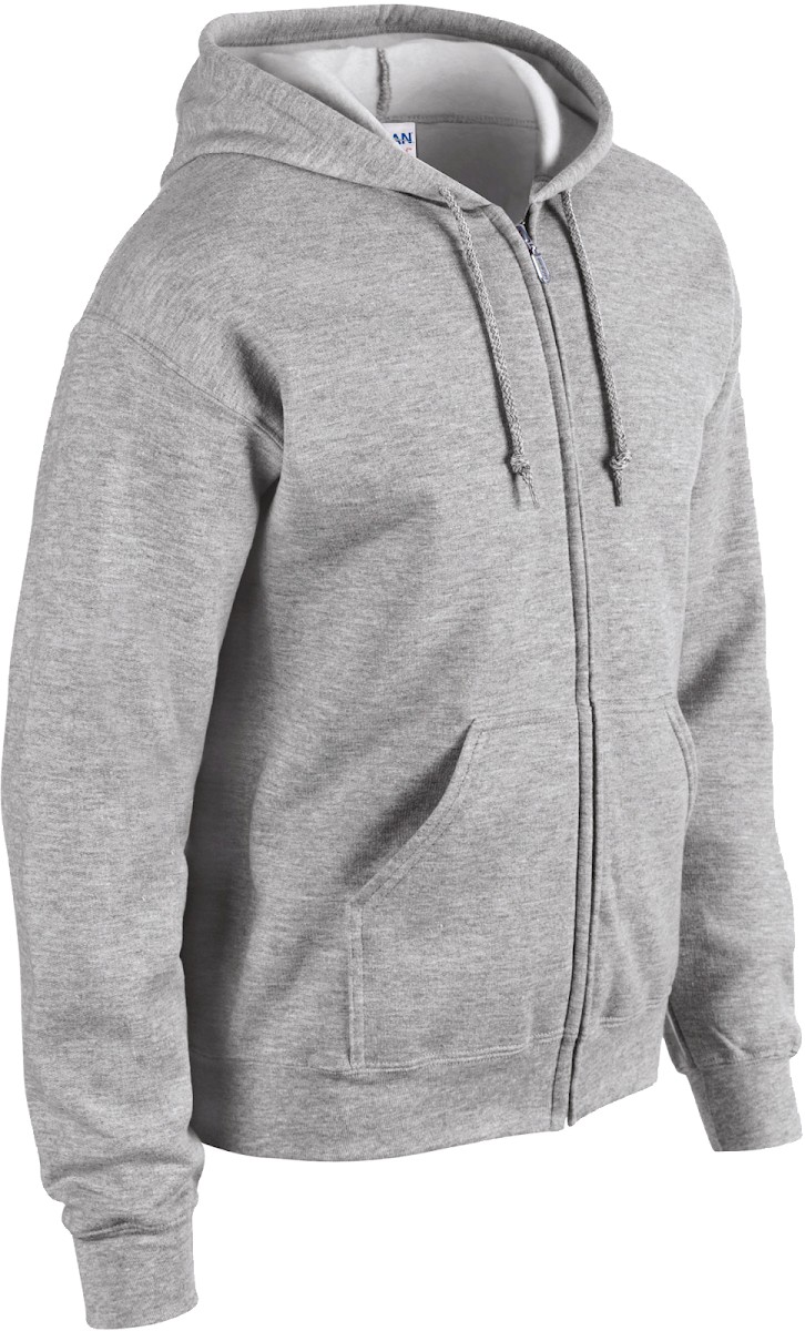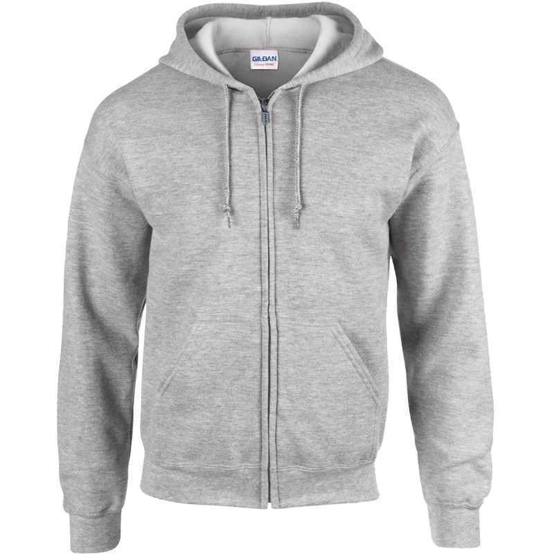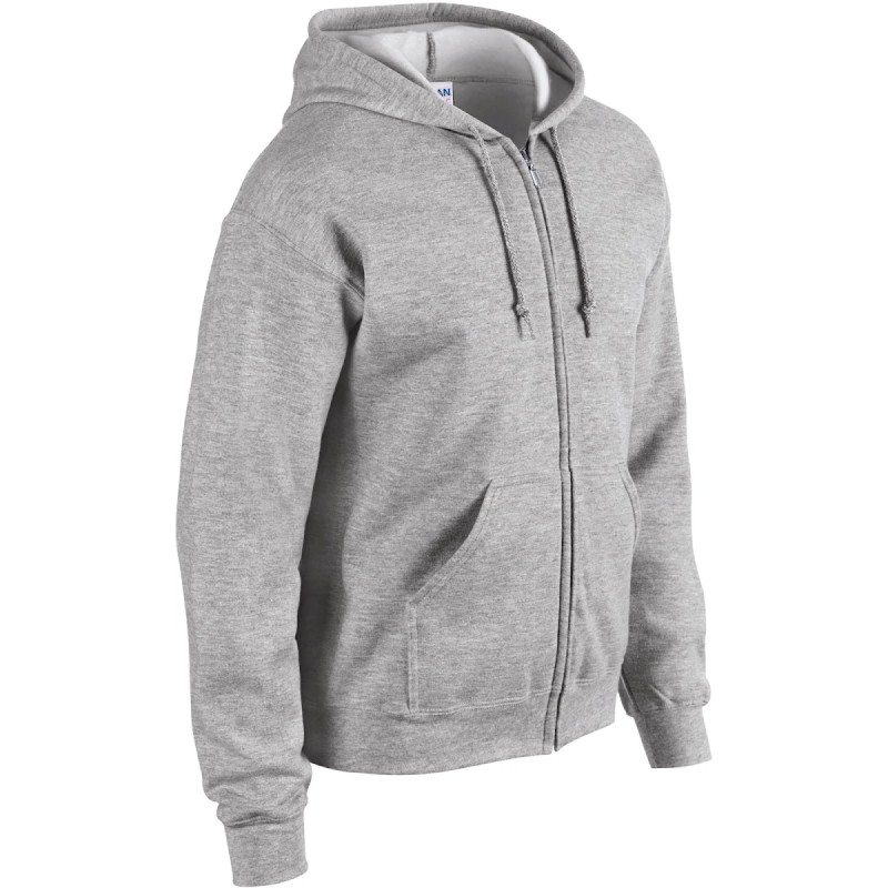 50% coton / 50% polyester. Molleton interieur gratté pré-rétreci. Fil "Air-Jet" pour une surface plus douce et anti-boulochage. Manches droites. Capuche non doublée avec cordons de couleur assortie. Zip métallique YKK® recouvert pour permettre l'impression sur tout le devant. Poches kangourou. Coupe classique.