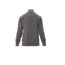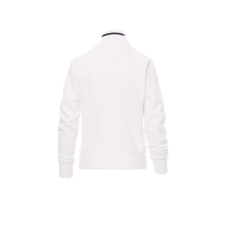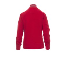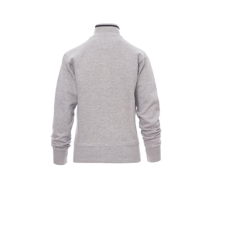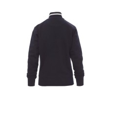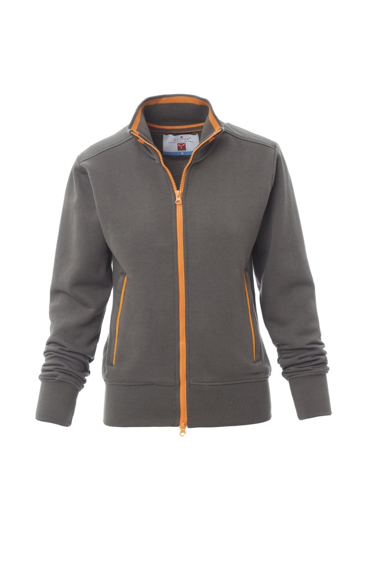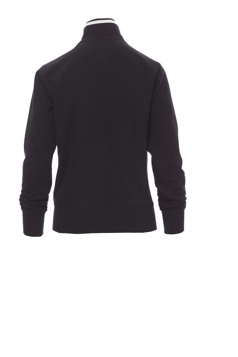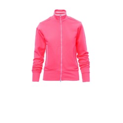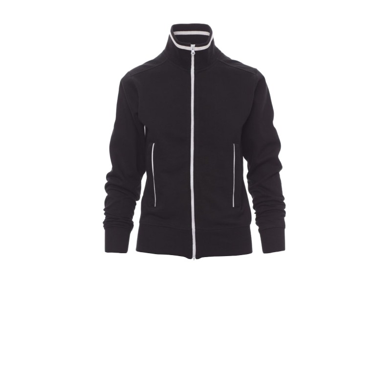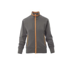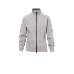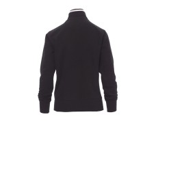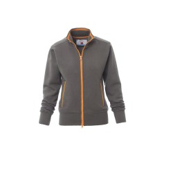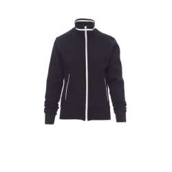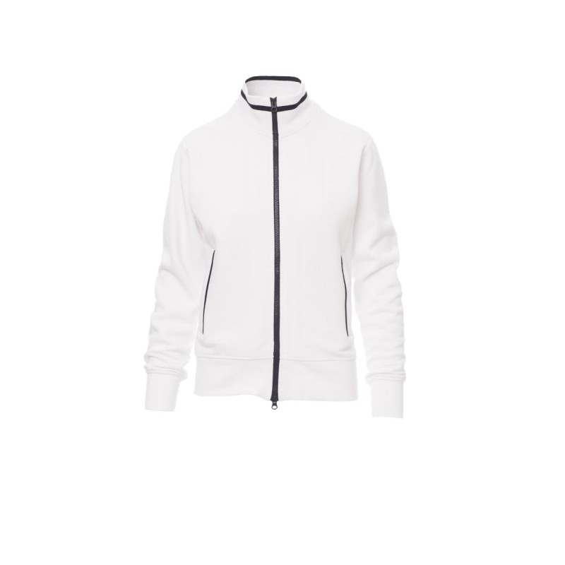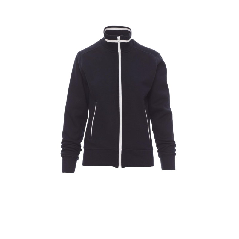 Sweat-shirt femme, coupe cintrée, full zip SBS en plastique contrasté, avec double curseur en métal. Col en bord-côte avec liseré contrasté repris sur les poches latérales . Manches montées, deux poches extérieures avec zip contrasté, poignets et taille en côtes élastiques. Coutures renforcées.