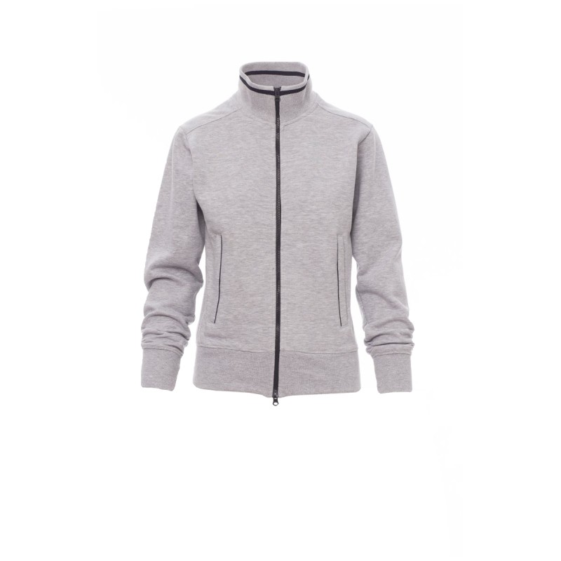 Sweat-shirt femme, coupe cintrée, full zip SBS en plastique contrasté, avec double curseur en métal. Col en bord-côte avec liseré contrasté repris sur les poches latérales . Manches montées, deux poches extérieures avec zip contrasté, poignets et taille en côtes élastiques. Coutures renforcées.