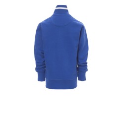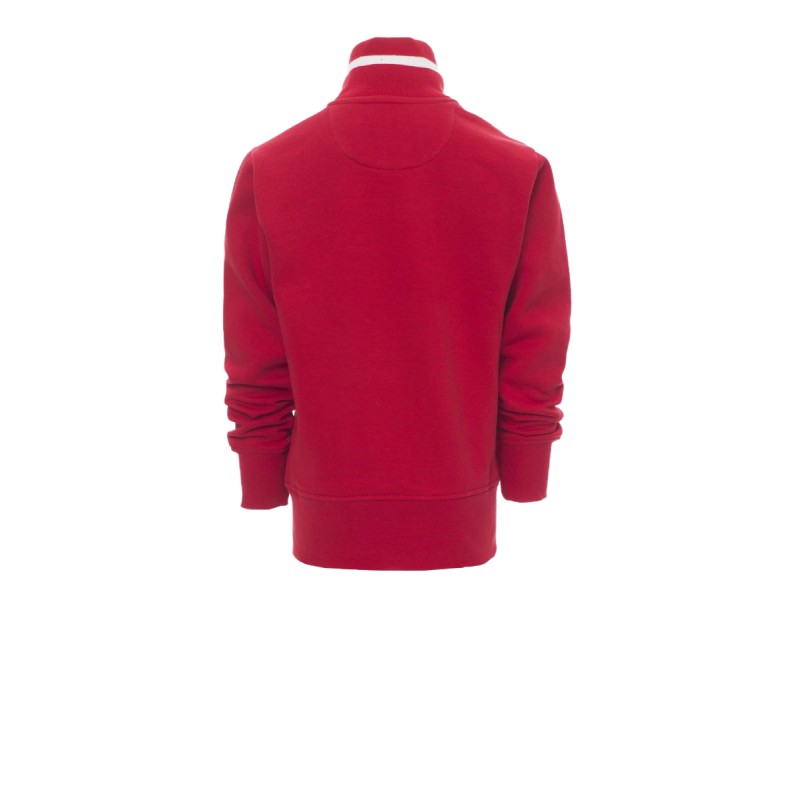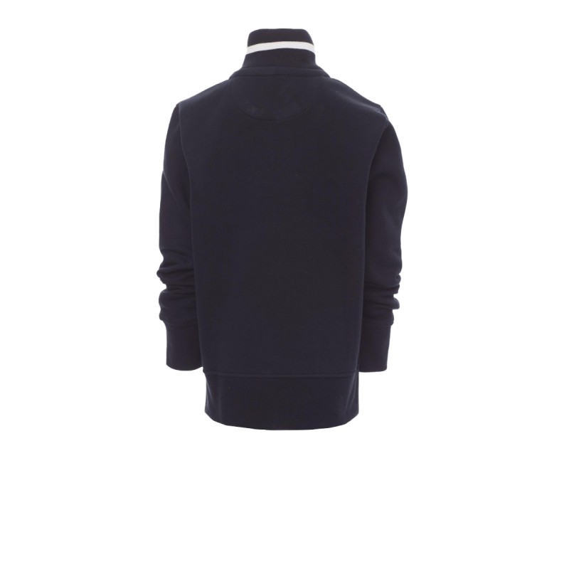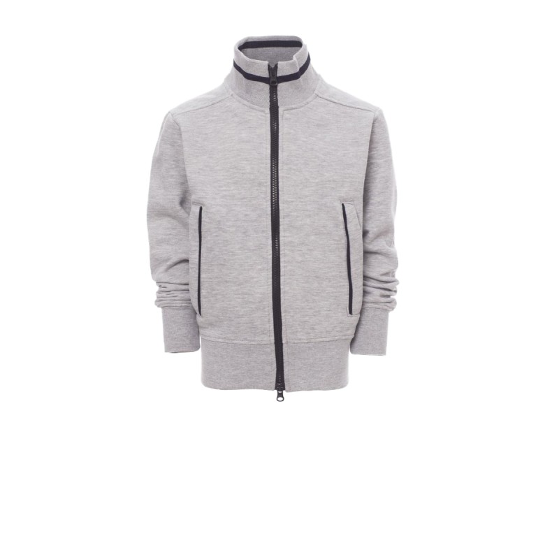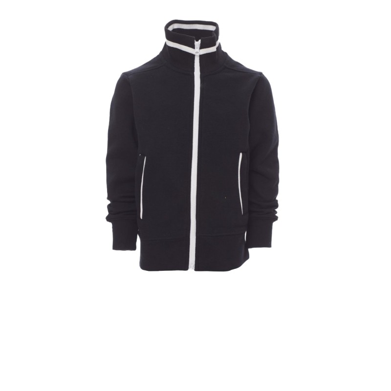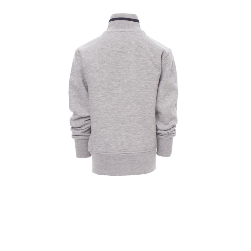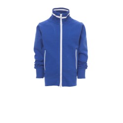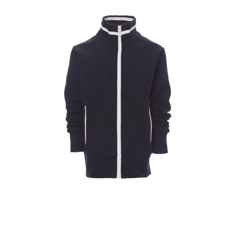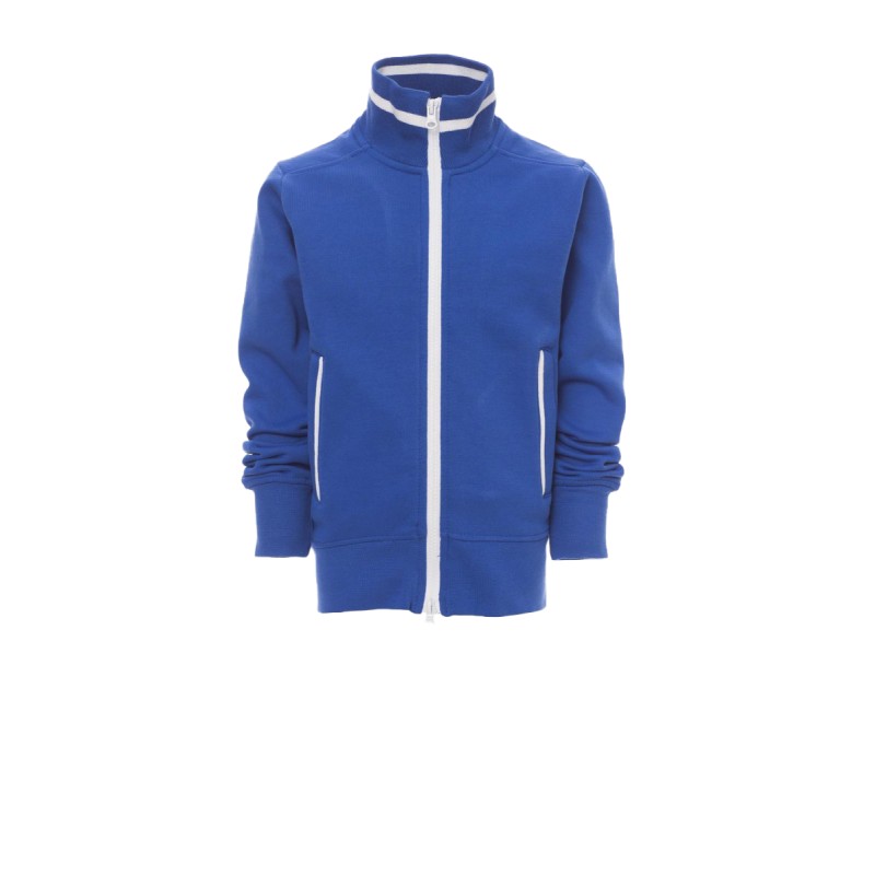 Sweat-shirt enfant, full zip SBS en plastique contrasté, avec double curseur en métal. Col en bord-côte avec liseré contrasté, repris sur les poches latérales . Manches montées, deux poches extérieures avec zip contrasté, poignets et taille en côtes élastiques. Coutures renforcées.