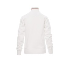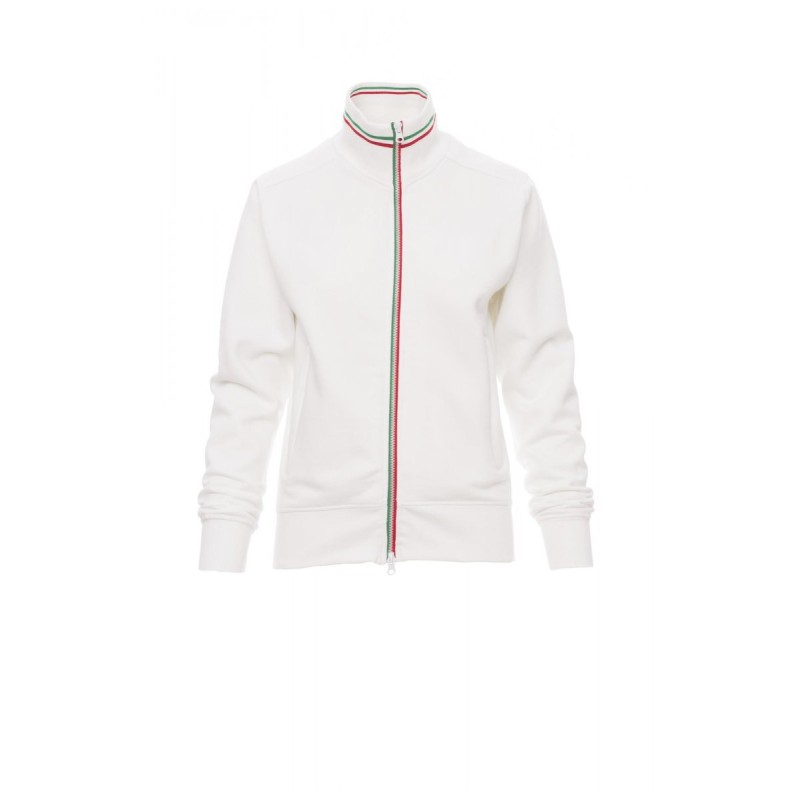 Sweat-shirt femme coupe cintrée, full zip SBS en plastique avec rayures tricolores contrastées et double curseur en métal. Col en bord-côtes avec rayures tricolores contrastées, manches montées, deux poches extérieures fermées par zip, poignets et taille en côtes élastiques. Coutures renforcées.