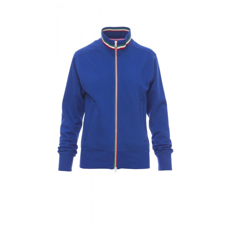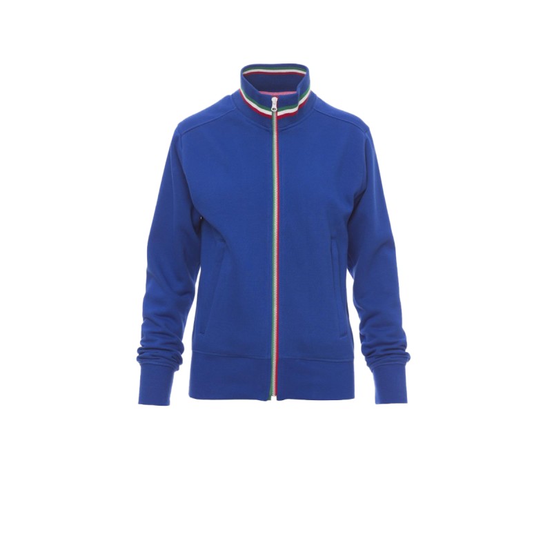 Sweat-shirt femme coupe cintrée, full zip SBS en plastique avec rayures tricolores contrastées et double curseur en métal. Col en bord-côtes avec rayures tricolores contrastées, manches montées, deux poches extérieures fermées par zip, poignets et taille en côtes élastiques. Coutures renforcées.
