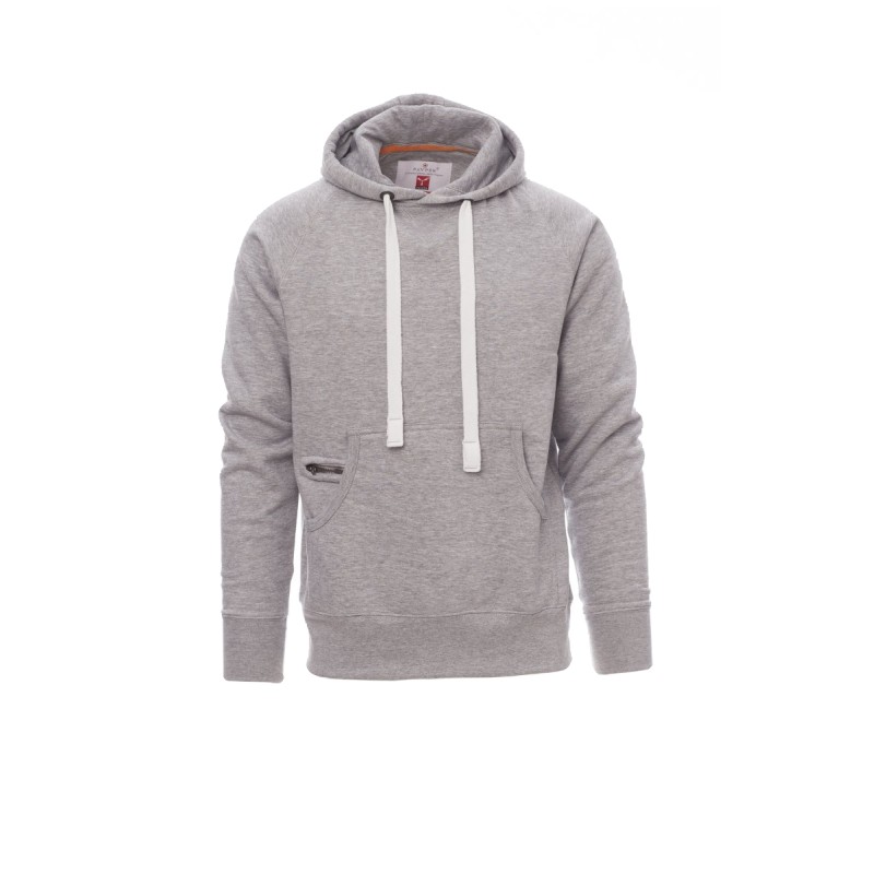 Sweat-shirt homme avec capuche à deux coutures et coulisse en cordon blanc à coutures teinte assortie et anneaux en métal . Manches raglan, couture esthétique en V au col, poches kangourou, petite poche zippée, poignets et taille en côtes élastiques, coutures renforcées.