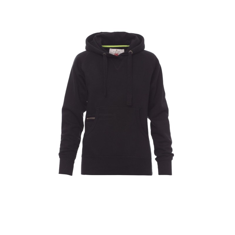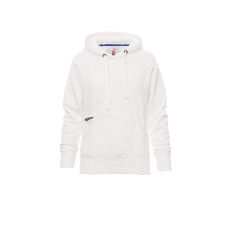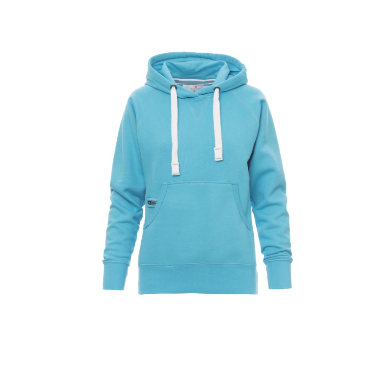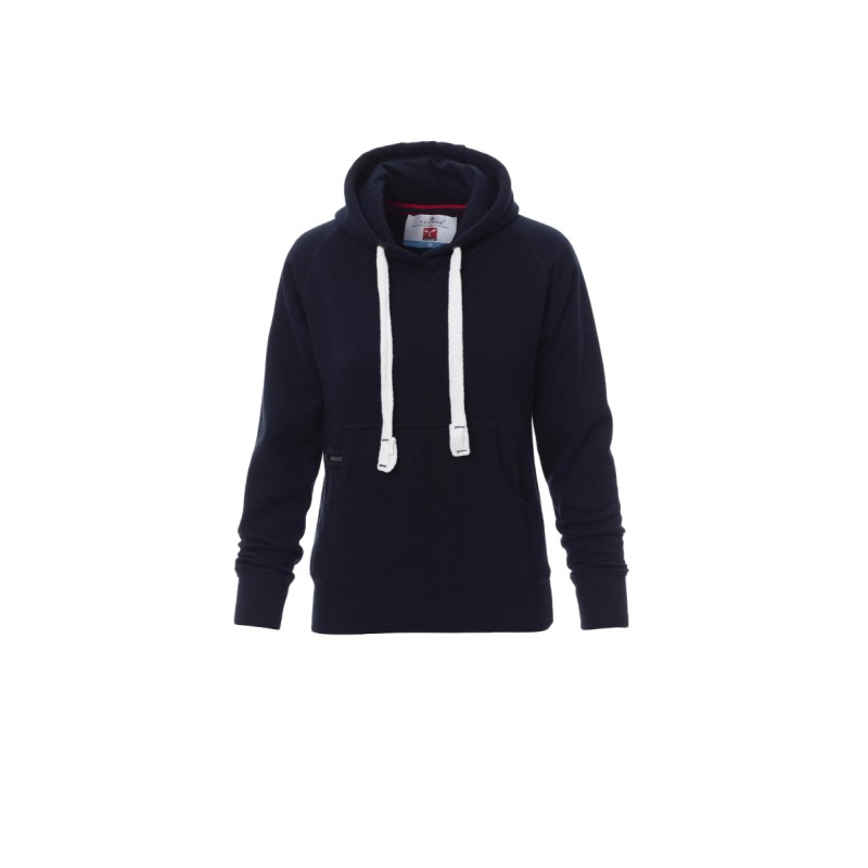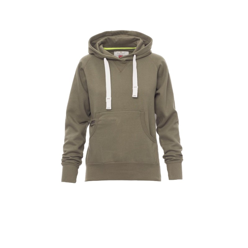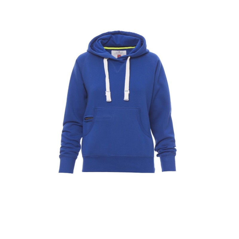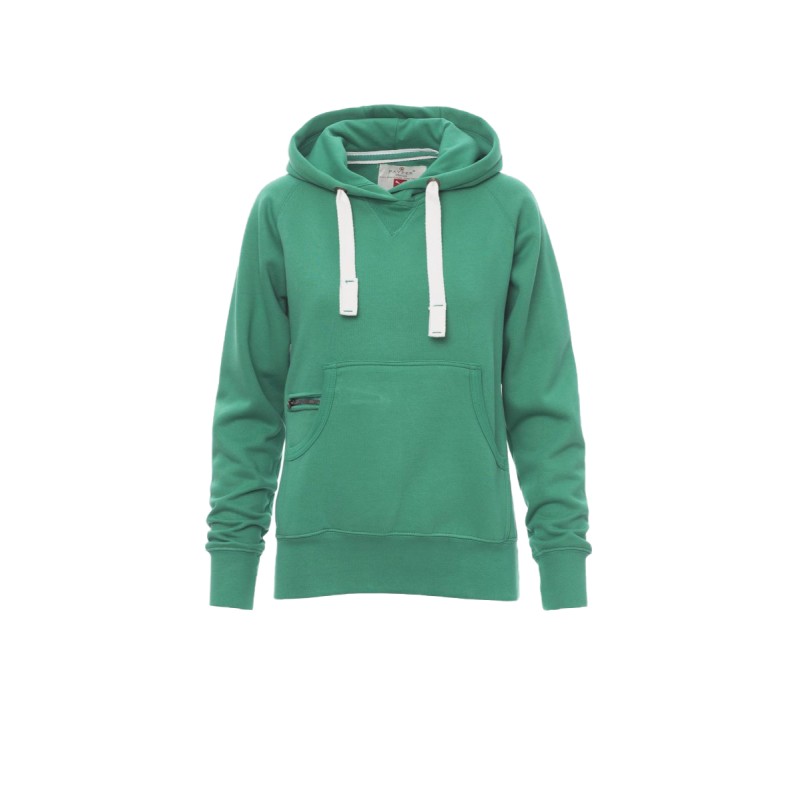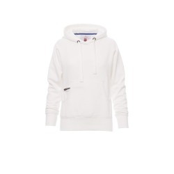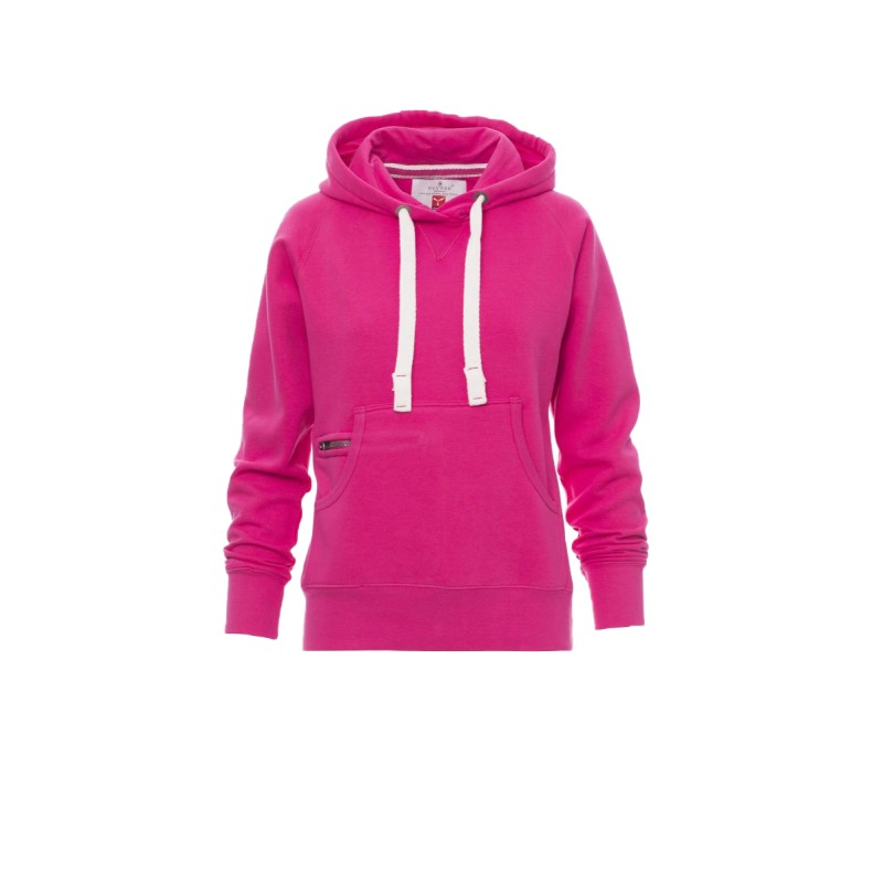 Sweat-shirt femme, coupe cintrée, avec capuche à deux coutures et coulisse en cordon blanc avec coutures teinte assortie et anneaux en métal . Manches raglan, couture esthétique en V au col, poches kangourou, petite poche à zip, poignets et taille en côtes élastiques, coutures renforcées.