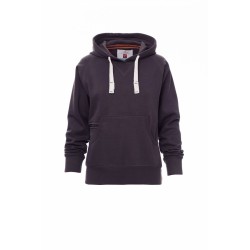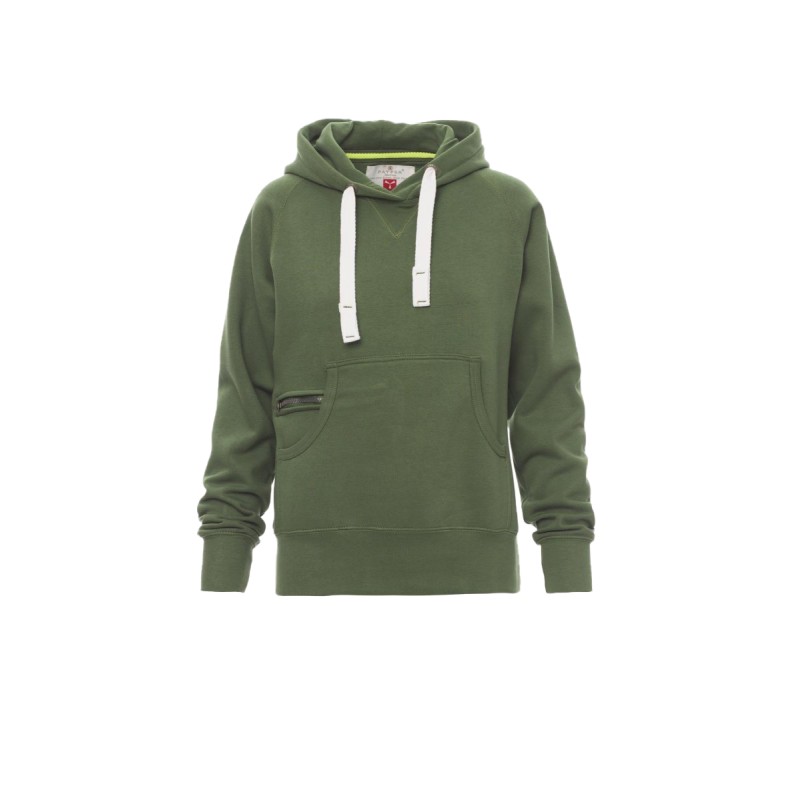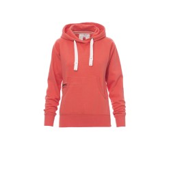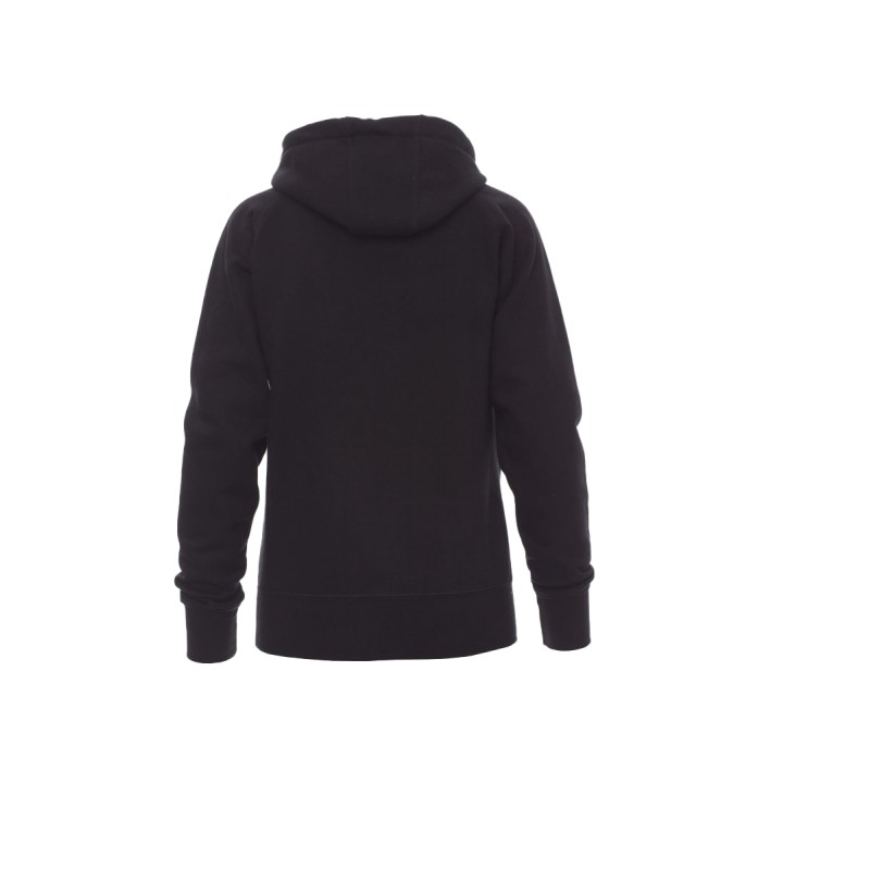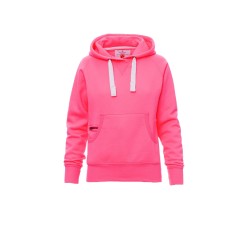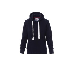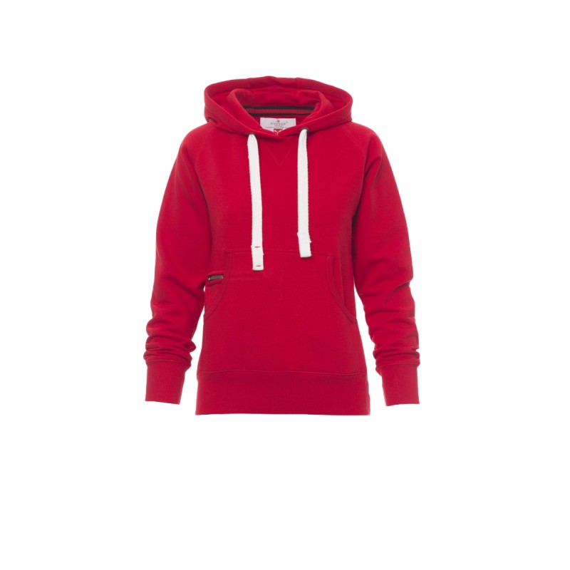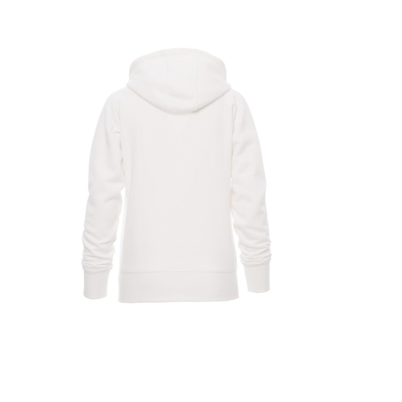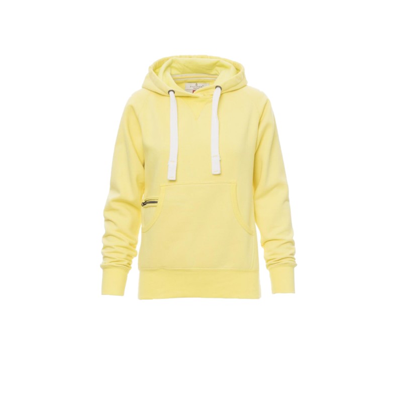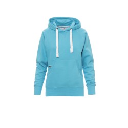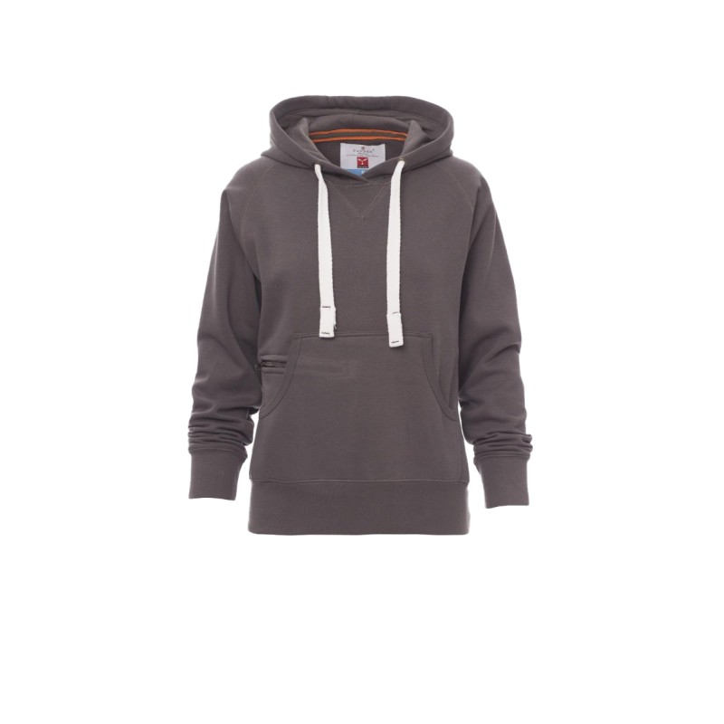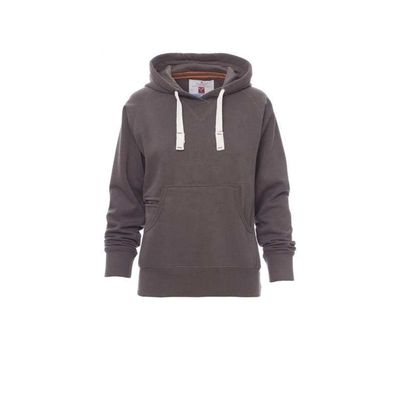 Sweat-shirt femme, coupe cintrée, avec capuche à deux coutures et coulisse en cordon blanc avec coutures teinte assortie et anneaux en métal . Manches raglan, couture esthétique en V au col, poches kangourou, petite poche à zip, poignets et taille en côtes élastiques, coutures renforcées.