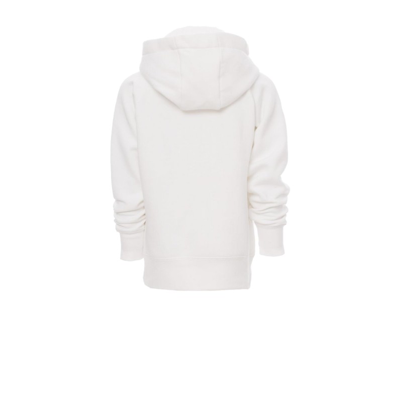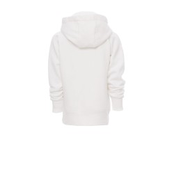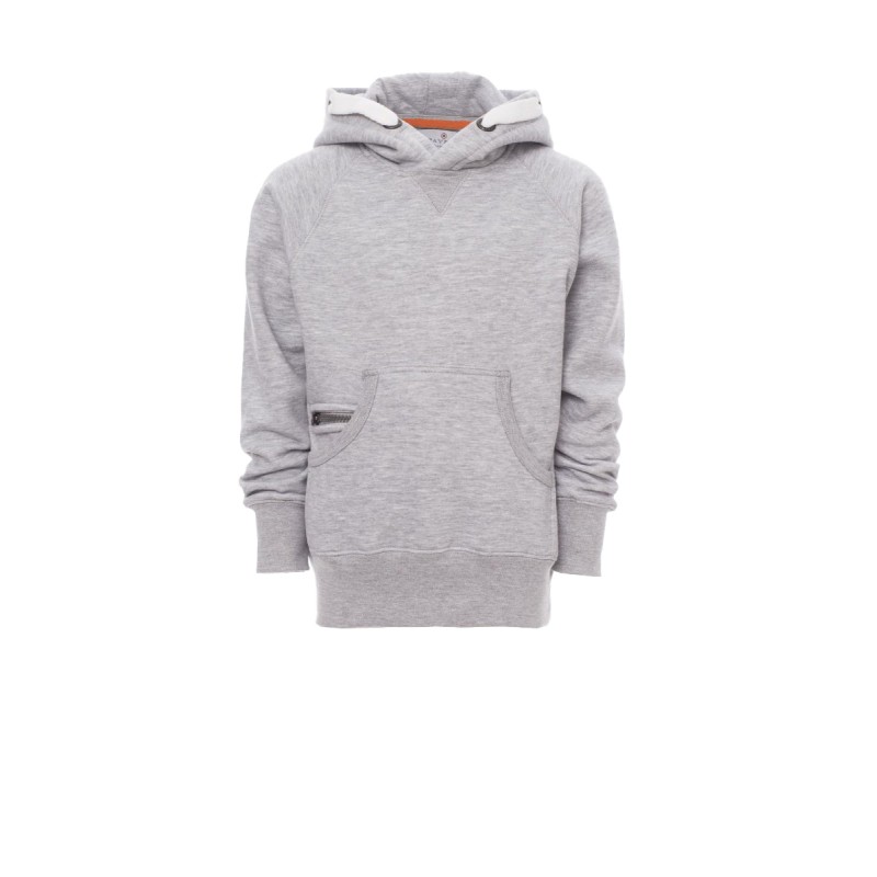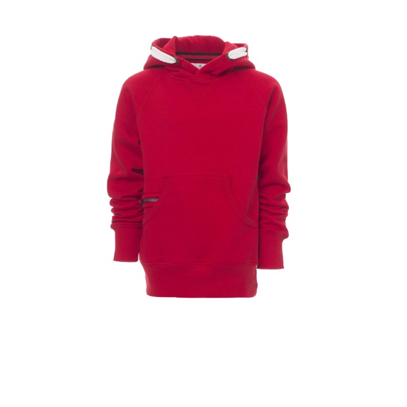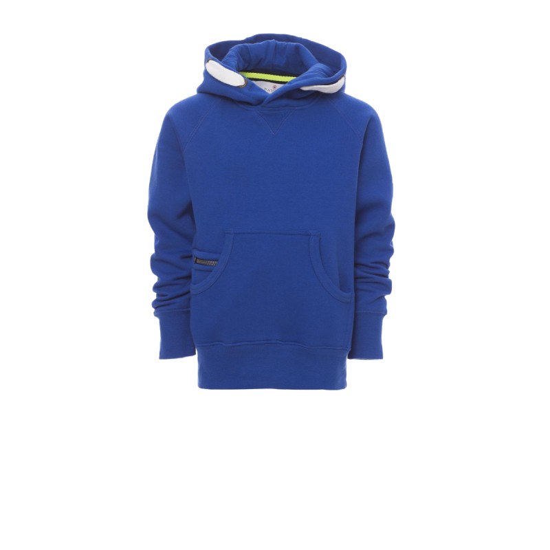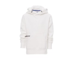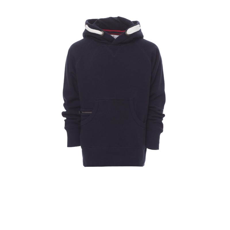 Sweat-shirt pour enfant, capuche à deux coutures, coulisse avec cordon blanc à coutures assorties au sweat-shirt fermé avec doubles en métal, manches raglan, couture esthétique en V au col, poches kangourou, petite poche zippée, poignets et taille en bord à côtes élastifié, coutures renforcées.