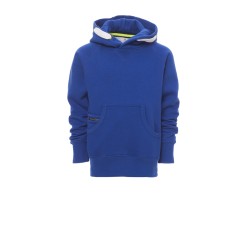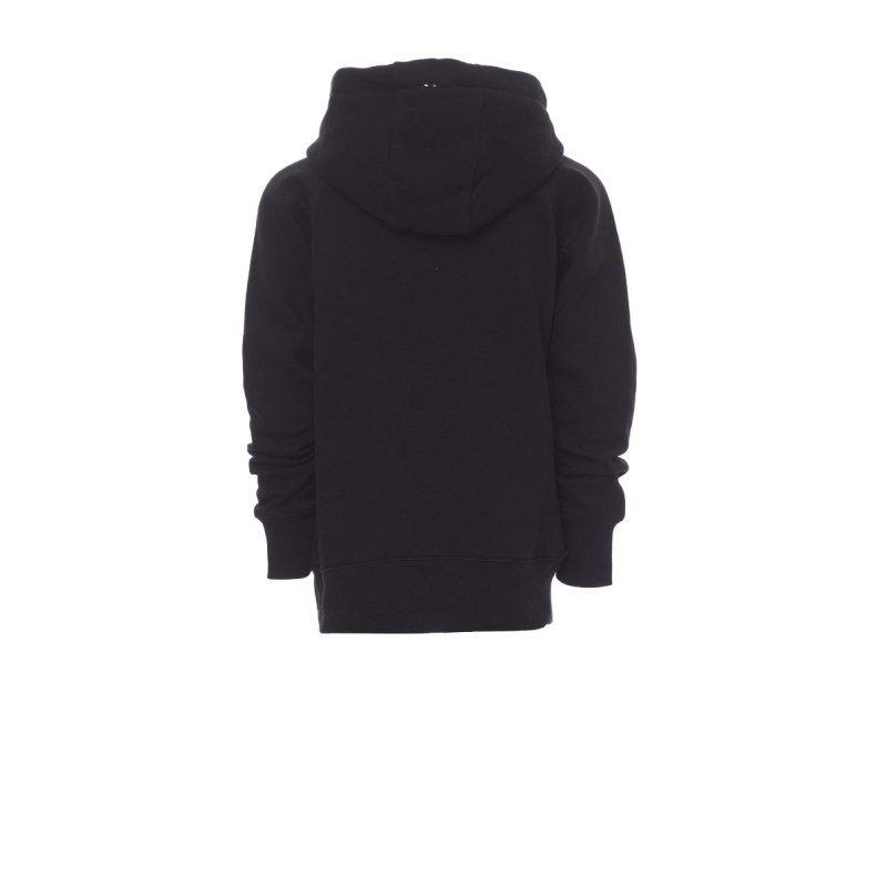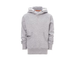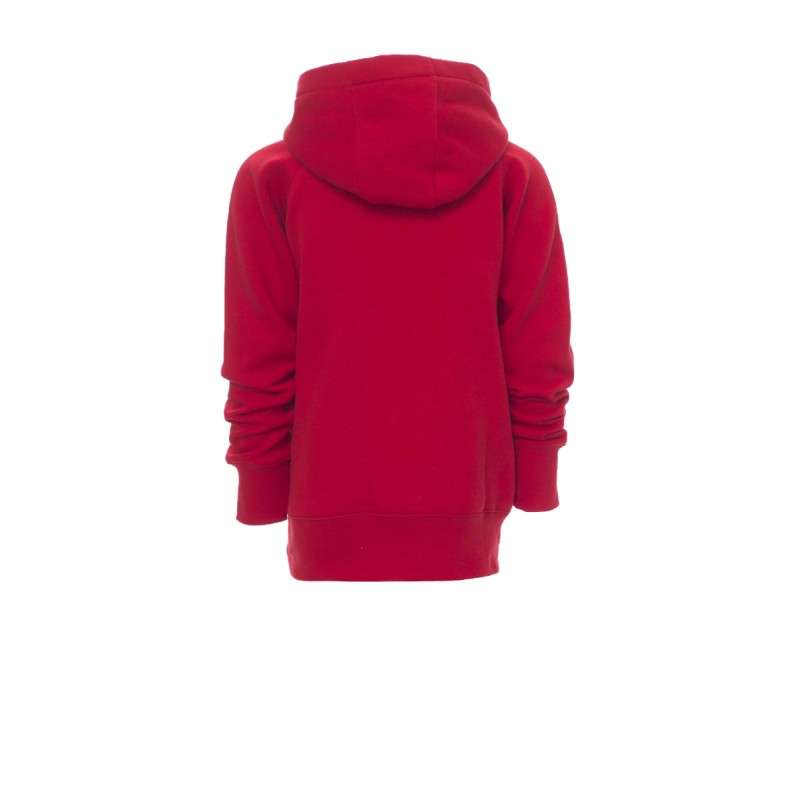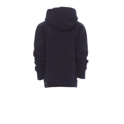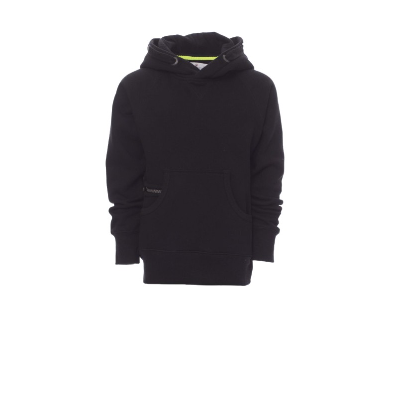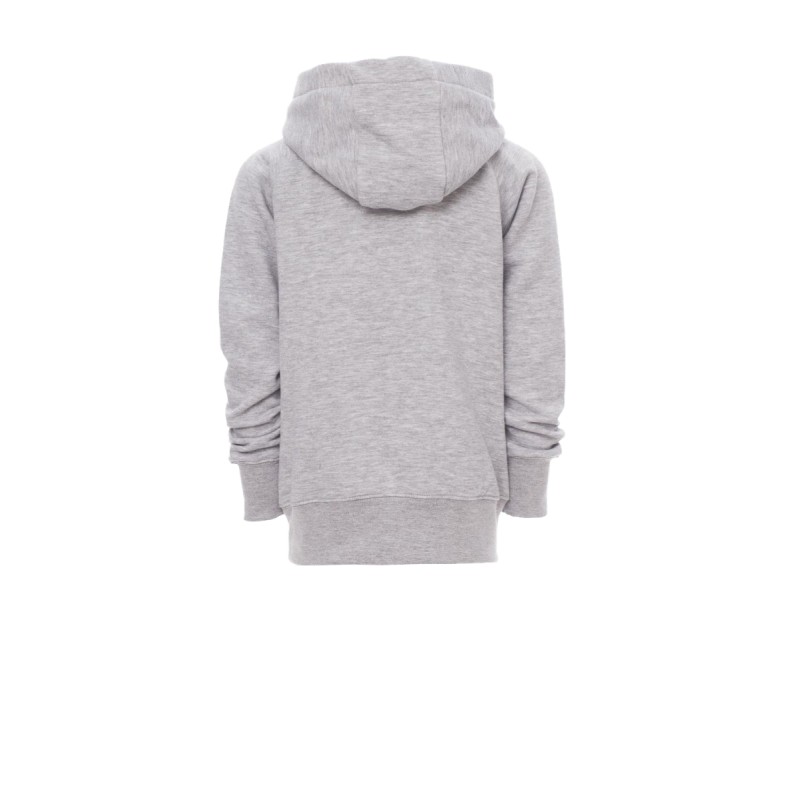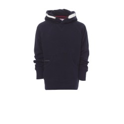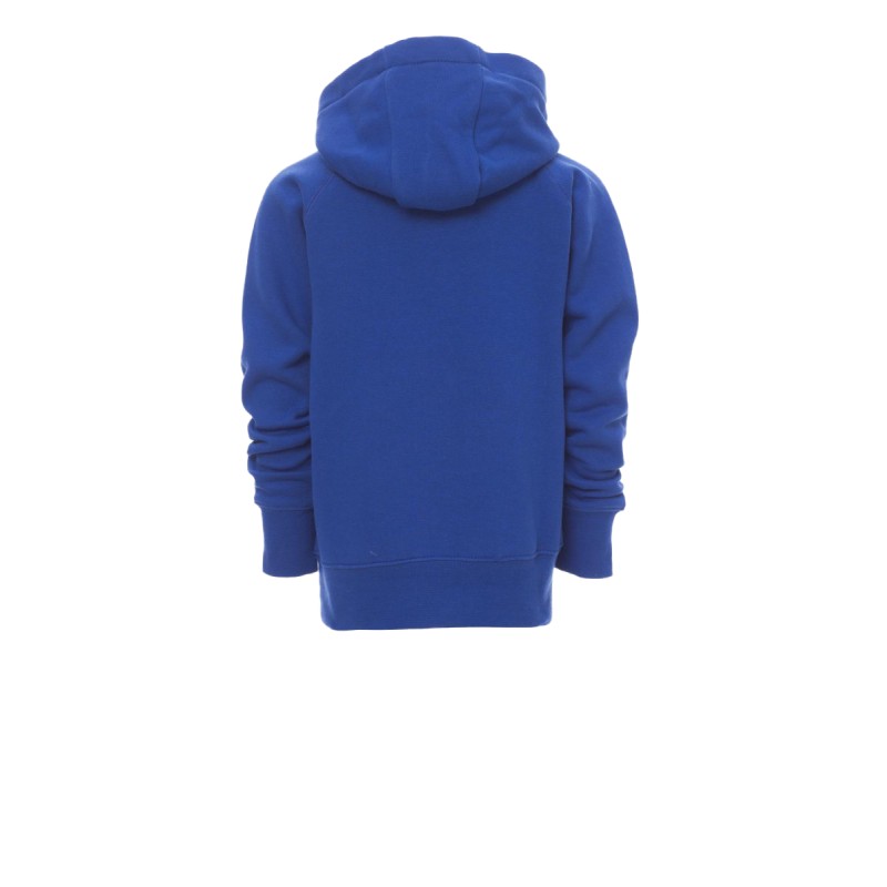Sweat-shirt pour enfant, capuche à deux coutures, coulisse avec cordon blanc à coutures assorties au sweat-shirt fermé avec doubles en métal, manches raglan, couture esthétique en V au col, poches kangourou, petite poche zippée, poignets et taille en bord à côtes élastifié, coutures renforcées.