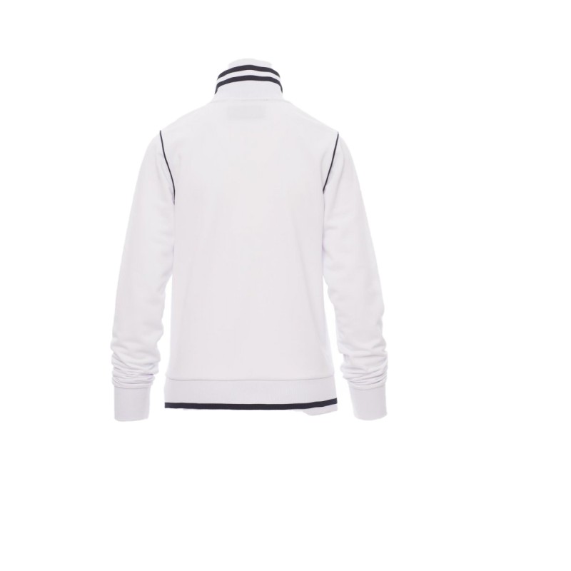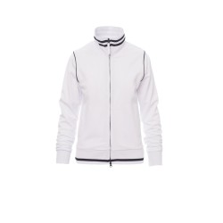Sweat-shirt femme, coupe cintrée, full zip en contraste couvert, en plastique et avec double curseur en métal. Col et taille en bord-côte avec rayures en contraste, poignets en côtes élastiques, passepoil aux emmanchures, deux poches latérales avec zip, coutures renforcées, traitement extérieur en piquet pour une meilleure transpiration du tissu.
