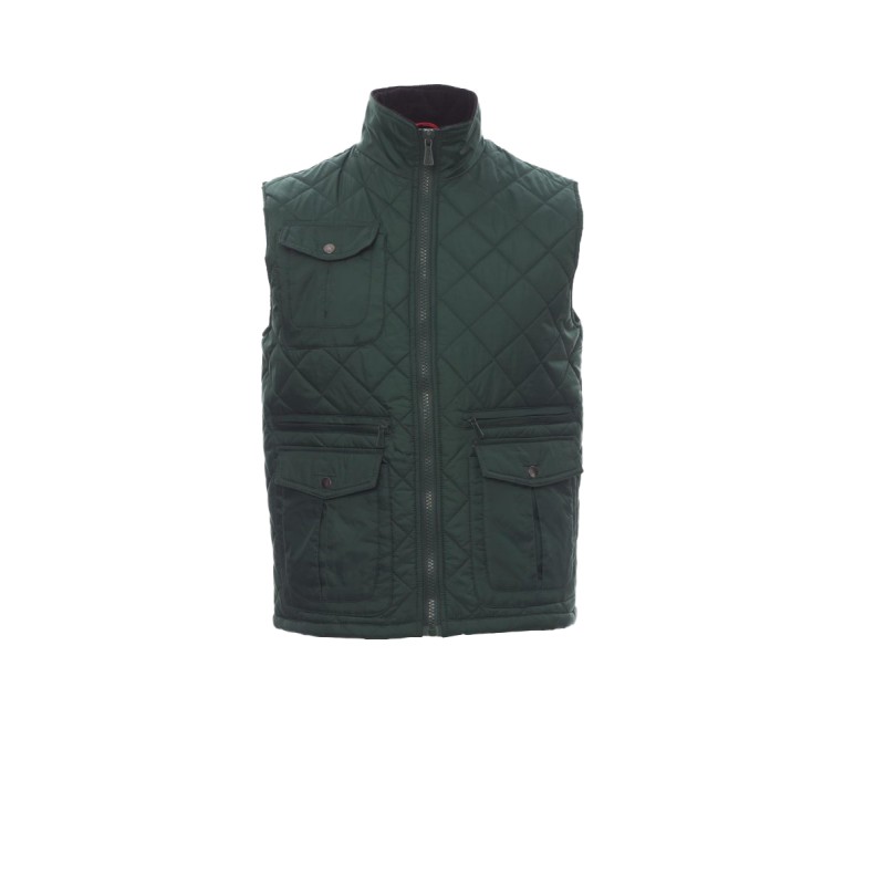 Gilet homme matelassé, zip de 8 mm en plastique avec curseur en métal, fentes latérales avec bouton, cinq poches extérieures, dont deux LOCK SYSTEM. Intérieur : rembourré, col en bord-côte de velours, une poche.