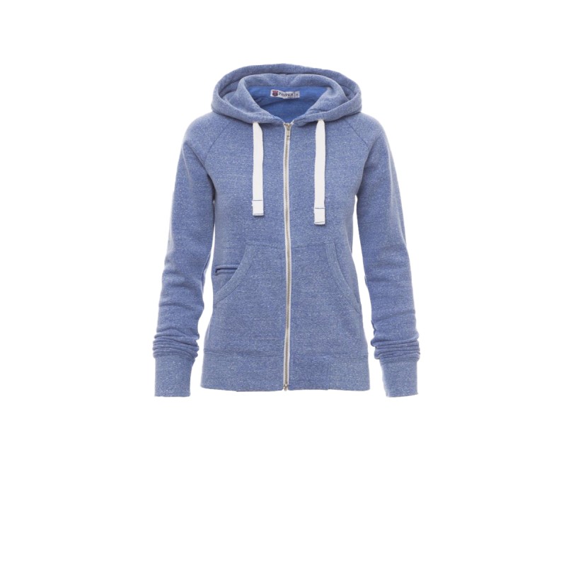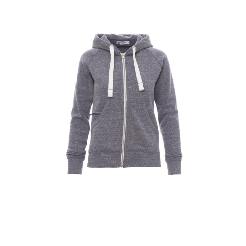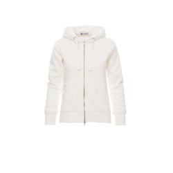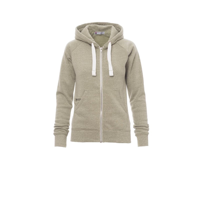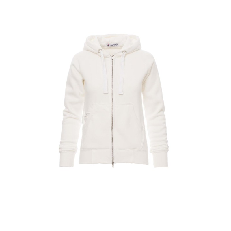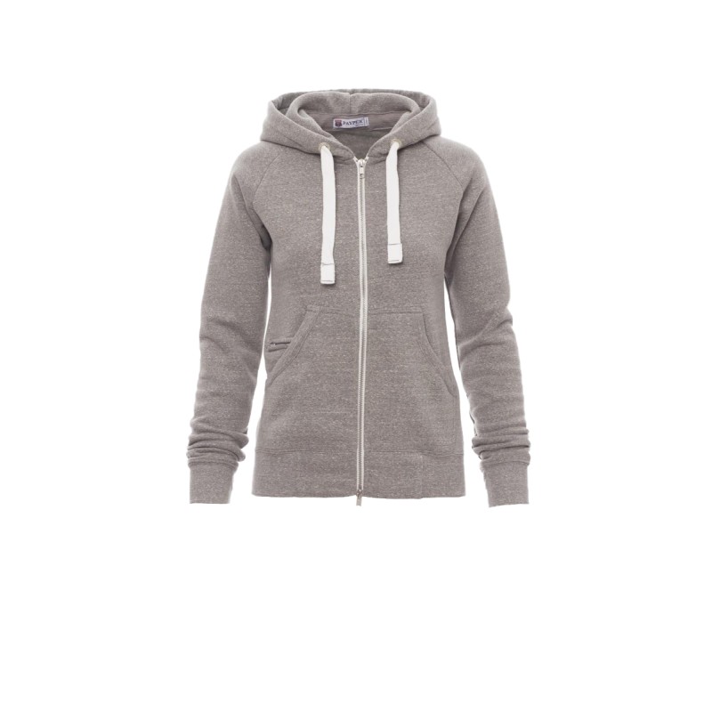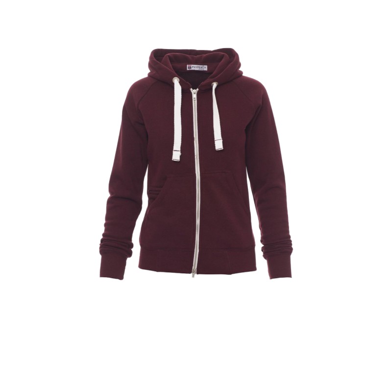 Sweat-shirt cintré pour femme à zip intégral en métal avec double curseur, manches raglan, capuche avec cordon coulissé blanc à coutures assorties au sweat-shirt et anneaux en métal, poches kangourou, petite poche avec zip et prédisposition pour câble mp3/portable, poignets et taille en bord côtes élastique, coutures renforcées. Effet Mélange blanc (noir pour le Bordeaux).