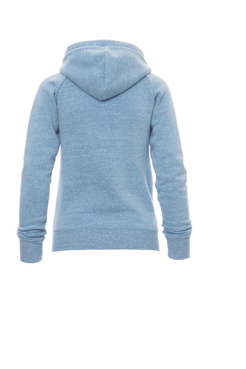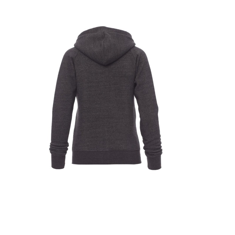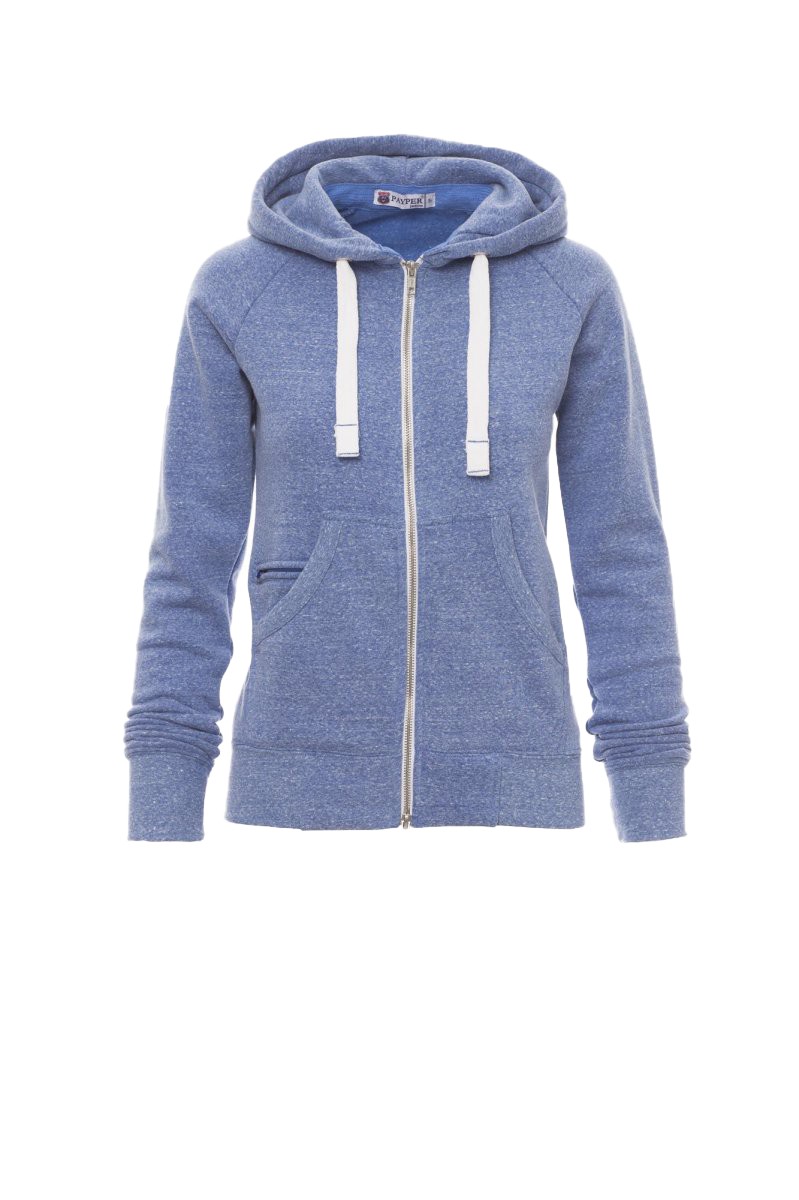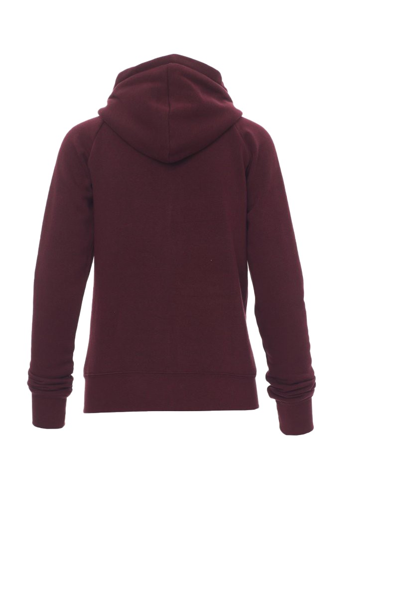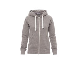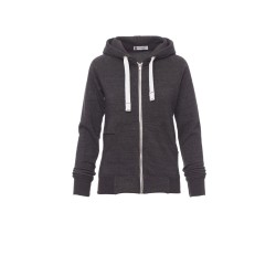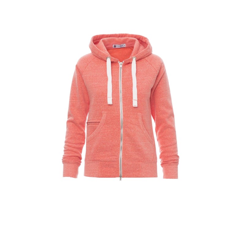 Sweat-shirt cintré pour femme à zip intégral en métal avec double curseur, manches raglan, capuche avec cordon coulissé blanc à coutures assorties au sweat-shirt et anneaux en métal, poches kangourou, petite poche avec zip et prédisposition pour câble mp3/portable, poignets et taille en bord côtes élastique, coutures renforcées. Effet Mélange blanc (noir pour le Bordeaux).