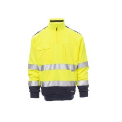 Sweat-shirt pour homme à haute visibilité avec bandes 3M, demi-zip en nylon avec curseur en métal, poignets et taille en bord côtes élastique, deux poches frontales avec zips couverts, une poche poitrine LOCK SYSTEM avec porte-badge détachable et refermable et une poche avec zip . Coutures renforcées