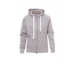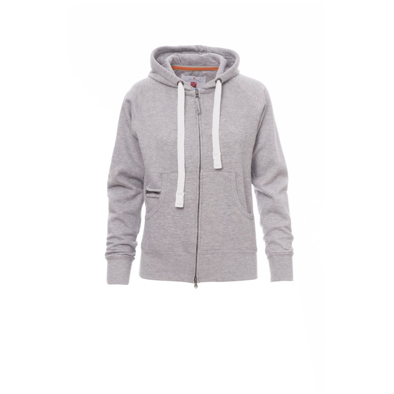 Sweat-shirt femme, coupe cintrée, full zip SBS couvert, en plastique et avec double curseur en métal . Capuche à deux coutures, coulisse en cordon blanc à coutures teinte assortie et anneaux en métal . Manches raglan, poches kangourou avec petite poche zippée, poignets et taille en côtes élastiques. Coutures renforcées.