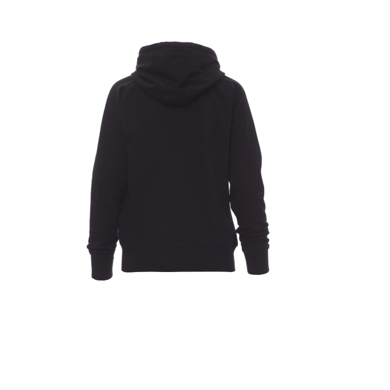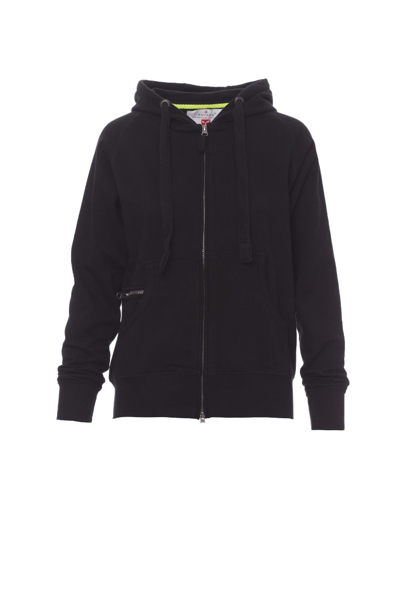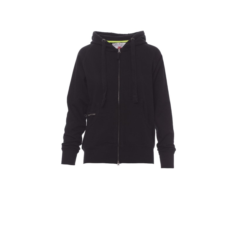 Sweat-shirt femme, coupe cintrée, full zip SBS couvert avec double curseur en métal . Capuche à deux coutures à coulisse en cordon blanc avec coutures teinte assortie et anneaux en métal . Manches raglan, poches kangourou avec petite poche zippée, poignets et taille en côtes élastiques. Coutures renforcées.