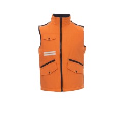 Gilet unisexe, à zip de 8 mm en plastique avec curseur en métal, à rabat et boutons en plastique, arrière profilé, deux poches extérieures LOCK SYSTEM et deux poches à fermeture éclair, poches obliques pour faciliter l'introduction des mains, une poche de poitrine pour smartphone et anneau porte-badge, passepoils réfléchissants sur poche de poitrine et au dos. Intérieur : rembourré, polaire en contraste au dos et sur le col, une poche, fermeture éclair intérieure pour faciliter impressions et broderies.