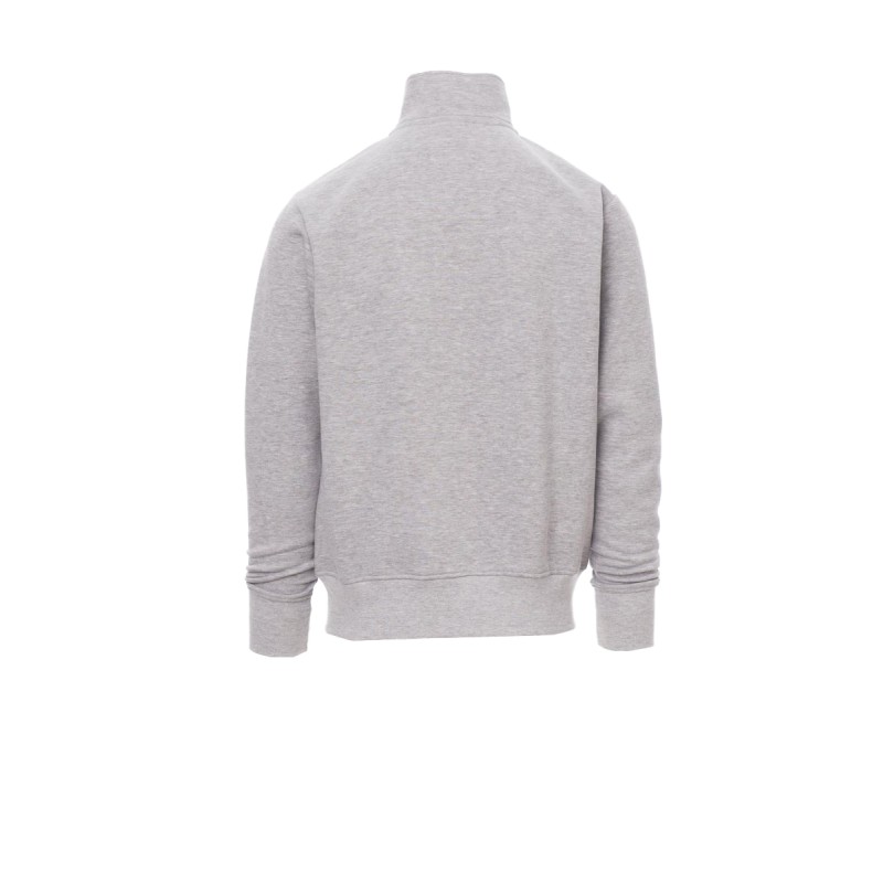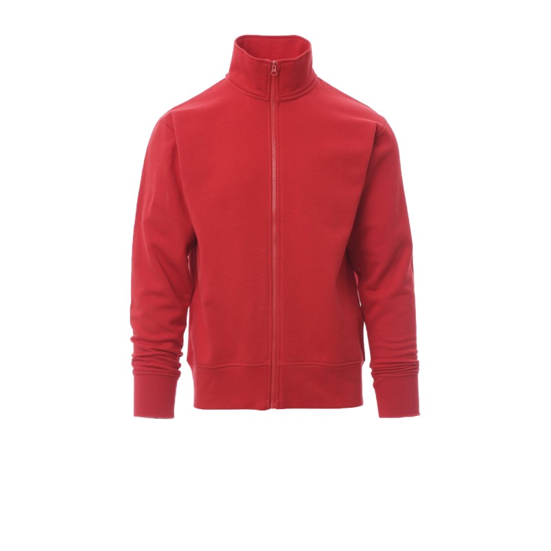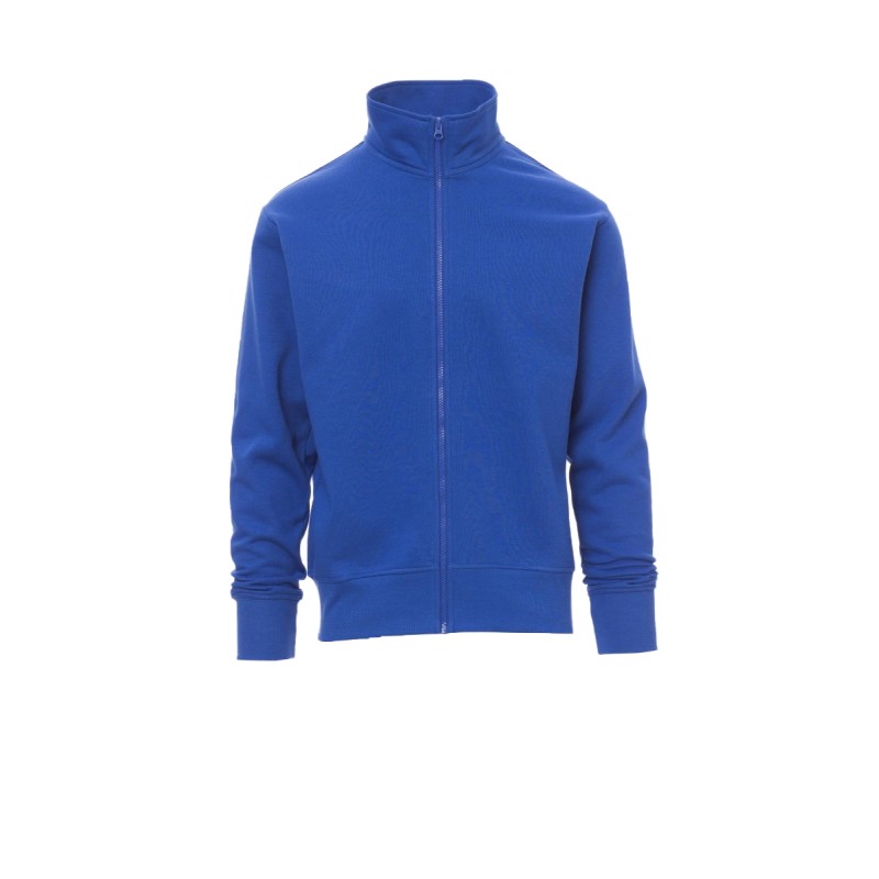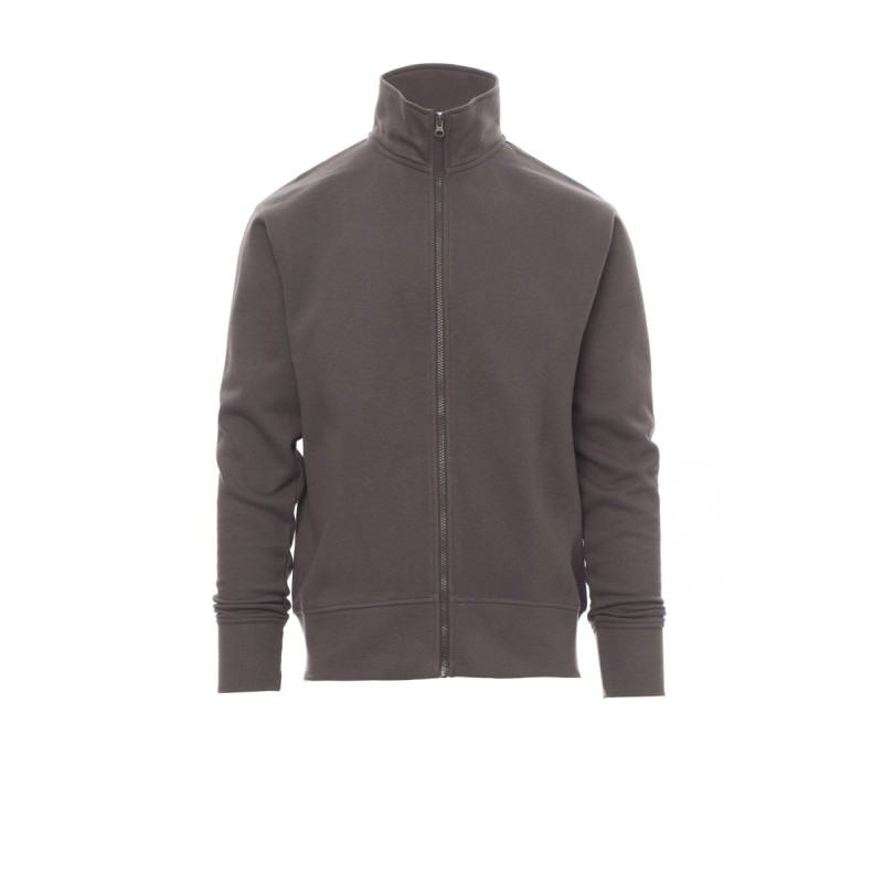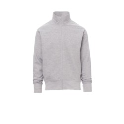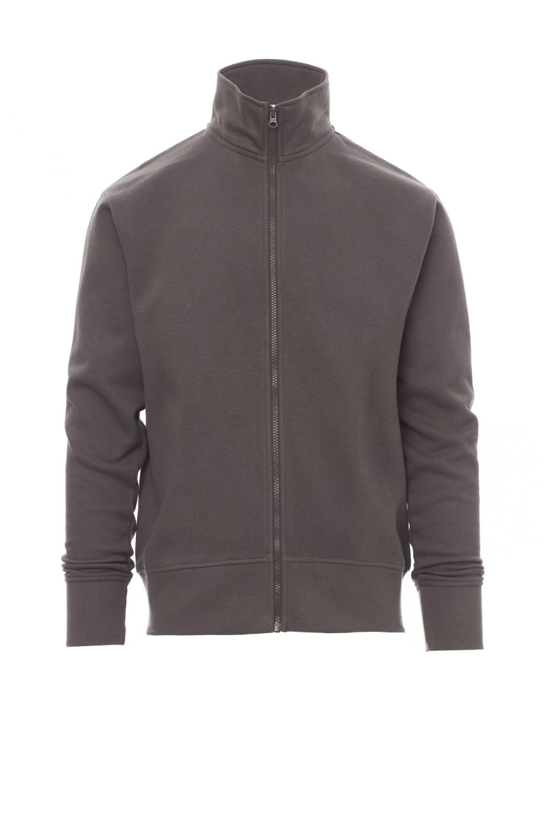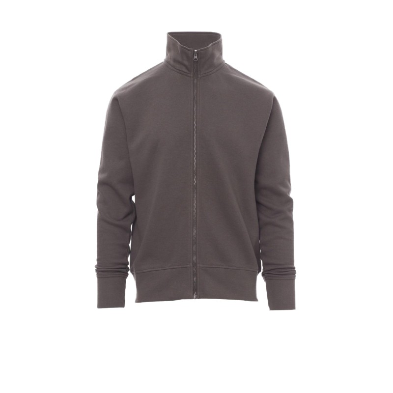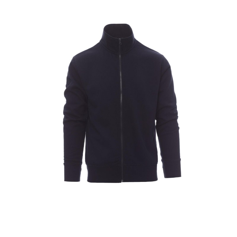 Sweat-shirt pour homme à zip intégral en plastique assorti avec curseur simple en métal, manches montées, poignets et taille en bord côtes élastique, coutures renforcées, ruban de renfort intérieur col assorti.