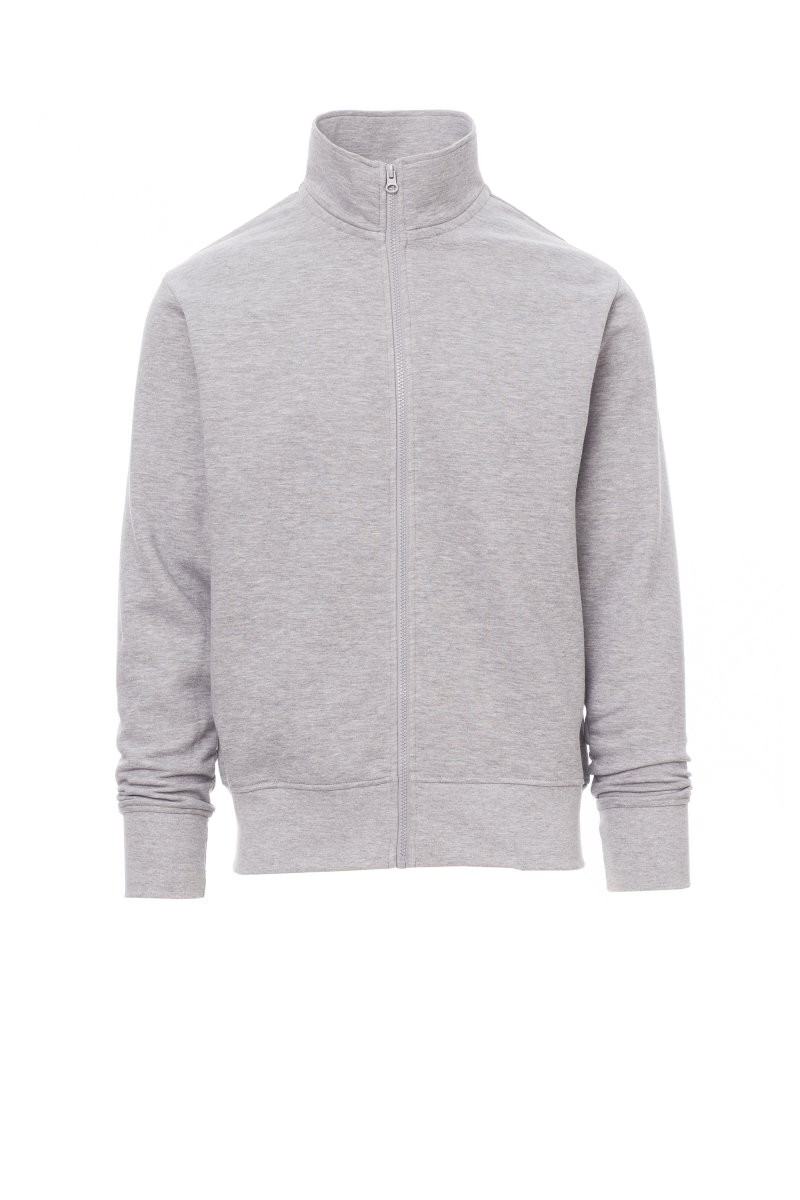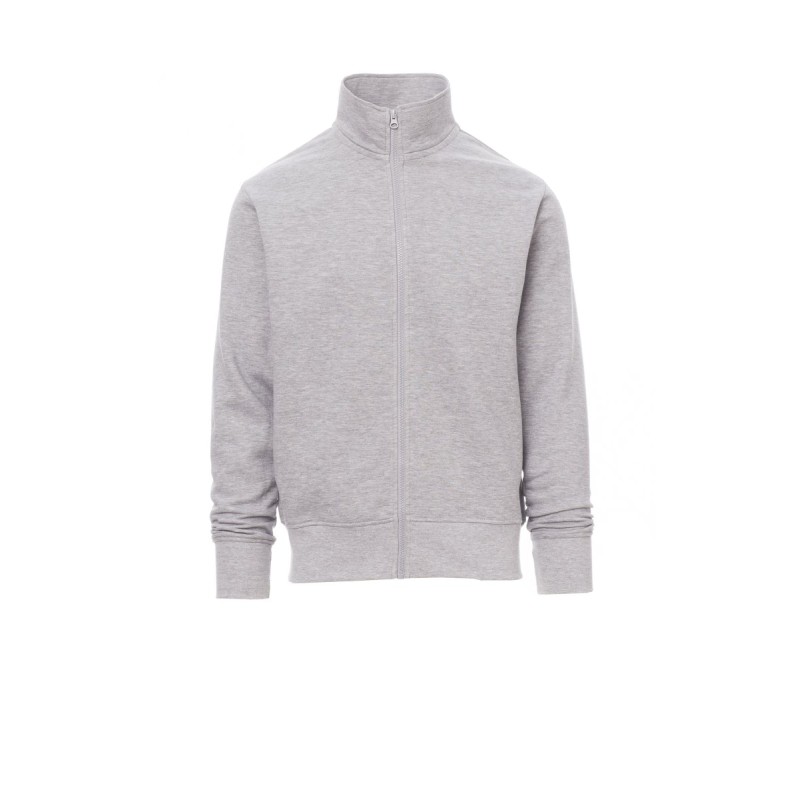 Sweat-shirt pour homme à zip intégral en plastique assorti avec curseur simple en métal, manches montées, poignets et taille en bord côtes élastique, coutures renforcées, ruban de renfort intérieur col assorti.