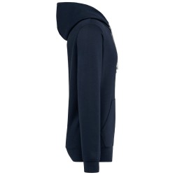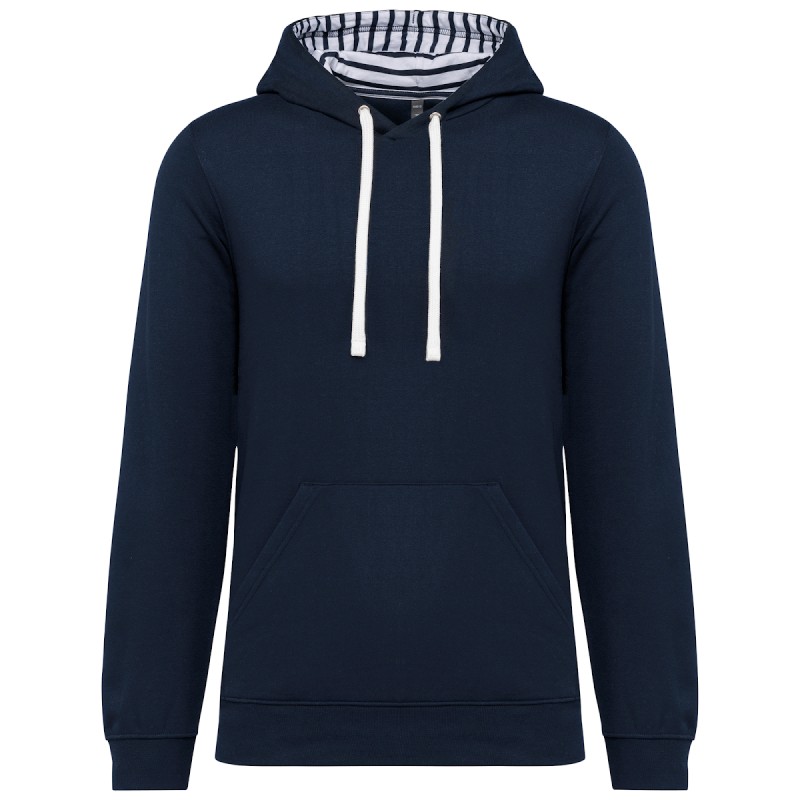80% coton / 20% polyester. Coton peigné. Molleton gratté 3 fils. Coupe ajustée. Manches droites. Poches kangourou. Finition demi-lune à l'encolure pour faciliter la personnalisation de marque à l'intérieur col. Finitions bord-côte 1x1 aux poignets et bas du vêtement. Capuche doublée avec tissu à thème en coton jersey imprimé et cordon de serrage contrasté. Etiquette de marque Tear Away.