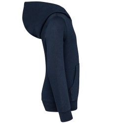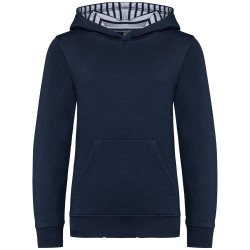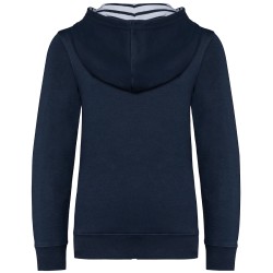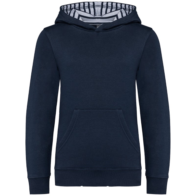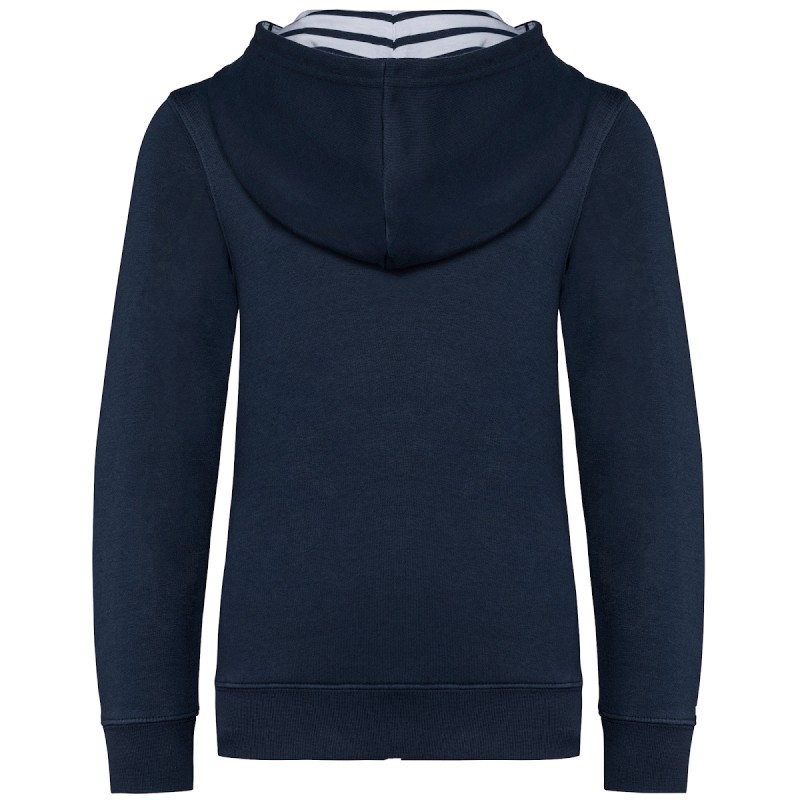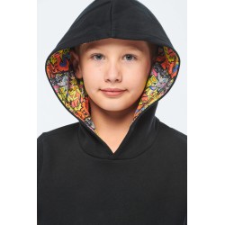80% coton / 20% polyester. Coton peigné. Molleton gratté 3 fils. Coupe ajustée. Manches droites. Poches kangourou. Finition demi-lune à l'encolure pour faciliter la personnalisation de marque à l'intérieur col. Finitions bord-côte 1x1 aux poignets et bas du vêtement. Capuche doublée avec tissu à thème en coton jersey imprimé. Etiquette de marque Tear Away.