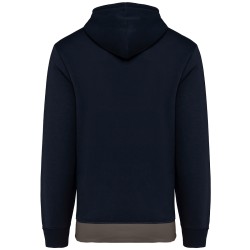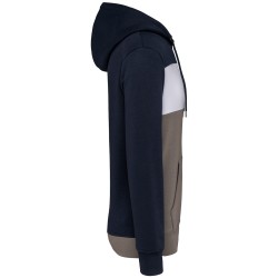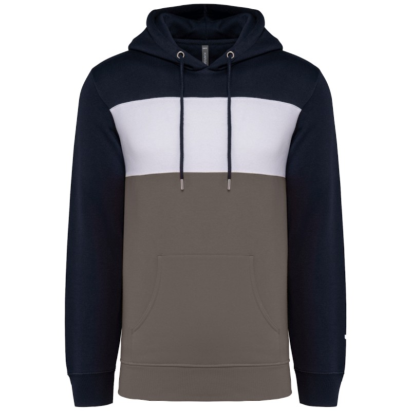 80% coton / 20% polyester. Surface extérieure 100% coton peigné. Molleton gratté 3 fils. LSF (Low shrinkage fleece). Lavage aux enzymes. Coupe ajustée. Sweatshirt capuche tricolore avec bande blanche centrale sur toutes les couleurs. Finition bords côte 1x1 bas de manche et bas de vêtement en tubulaire pour une meilleure finition, avec surpiqûre. Poche kangourou avec double surpiqûre. Capuche à plis avec œillet et embouts cordons en métal, avec cordons de serrage ronds. Bande de propreté en chevrons ton sur ton. Présence d’élasthanne sur bas de manches et de vêtement pour éviter que le vêtement se déforme. Demi-lune au dos pour faciliter la personnalisation. Etiquette de marque au col ainsi qu’une puce de taille déchirables pour faciliter la personnalisation.