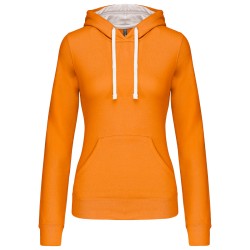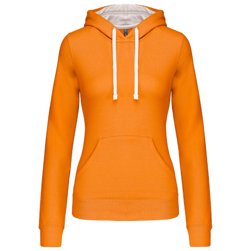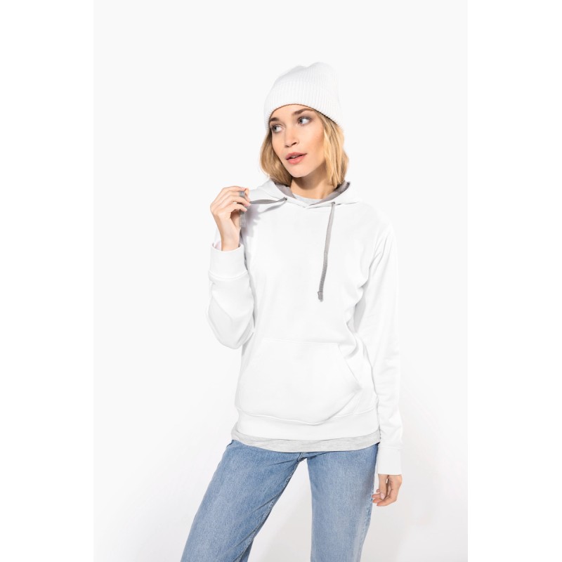 80% coton / 20% polyester. Coton peigné. Molleton gratté. Passe-fil écouteurs dans la poche kangourou et encolure. Bord-côte bas de manches et de vêtement. Capuche doublée et contrastée avec cordon de serrage.