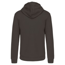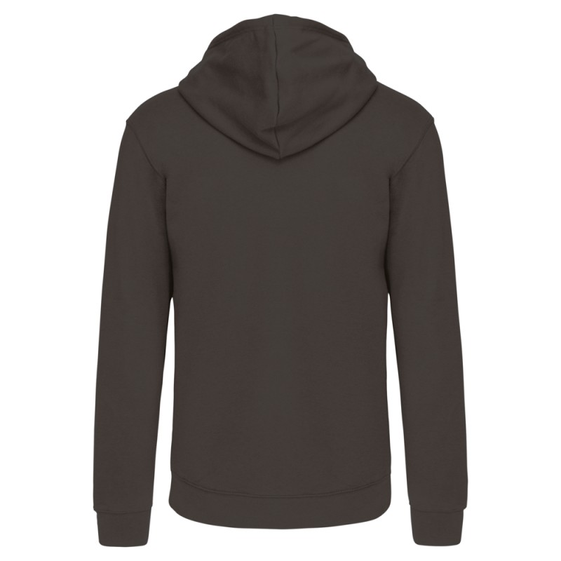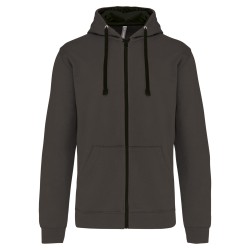 80% coton / 20% polyester. Coton peigné. Molleton gratté. Passe fil écouteurs dans la poche kangourou et encolure. Bord-côte bas de manches et de vêtement. Capuche doublée et contrastée avec cordon de serrage. Zip contrasté.