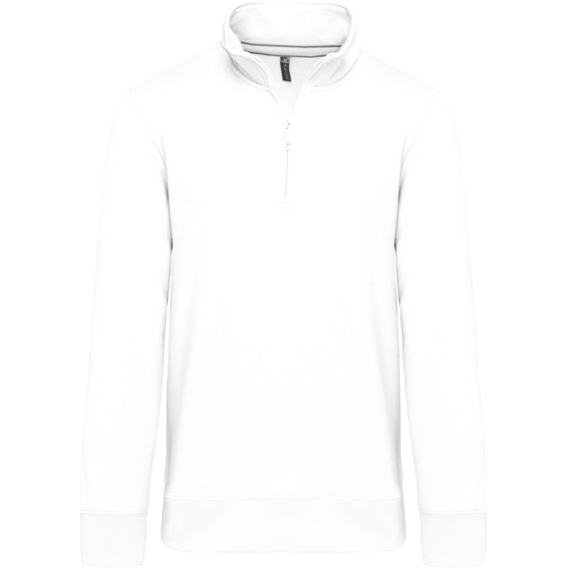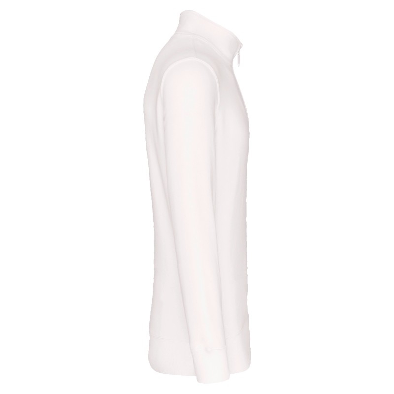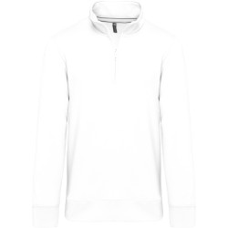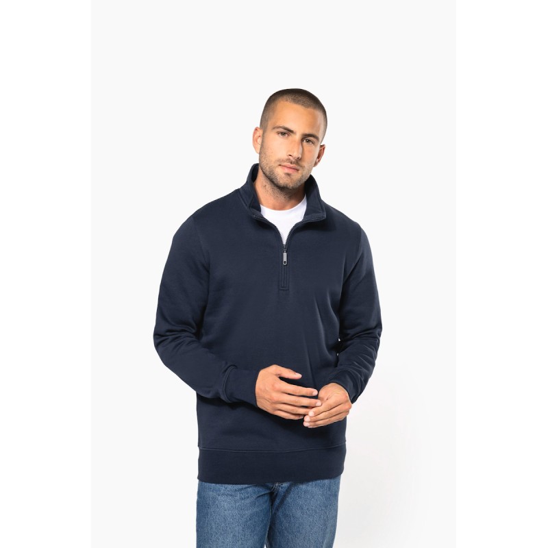 80% coton / 20% polyester (Ash Heather : 79% coton / 20% polyester / 1% viscose). Surface extérieure 100% coton. Traitement LSF (Low Shrinkage Fleece : molleton prérétréci). Molleton gratté 3 fils en coton peigné. Manches montées. Col avec fermeture zippée plastique ton sur ton. Bande de propreté contrastée à l'encolure (Navy pour le coloris Oxford Grey et Ash Heather ; Oxford Grey pour tous les autres coloris). Finition bord-côte poignets et de bas de vêtement.