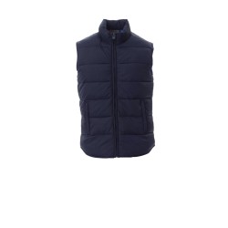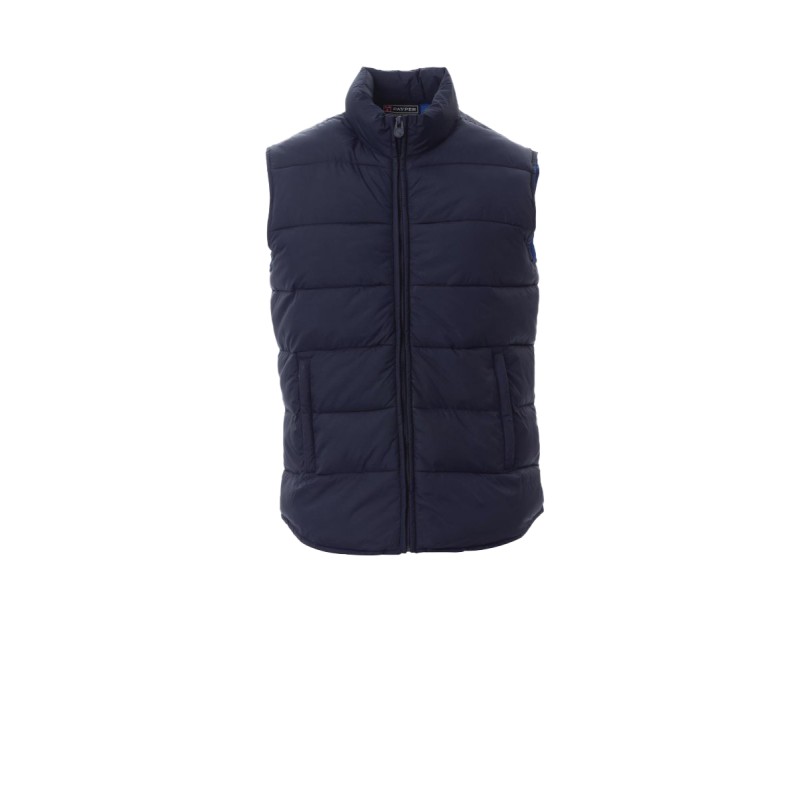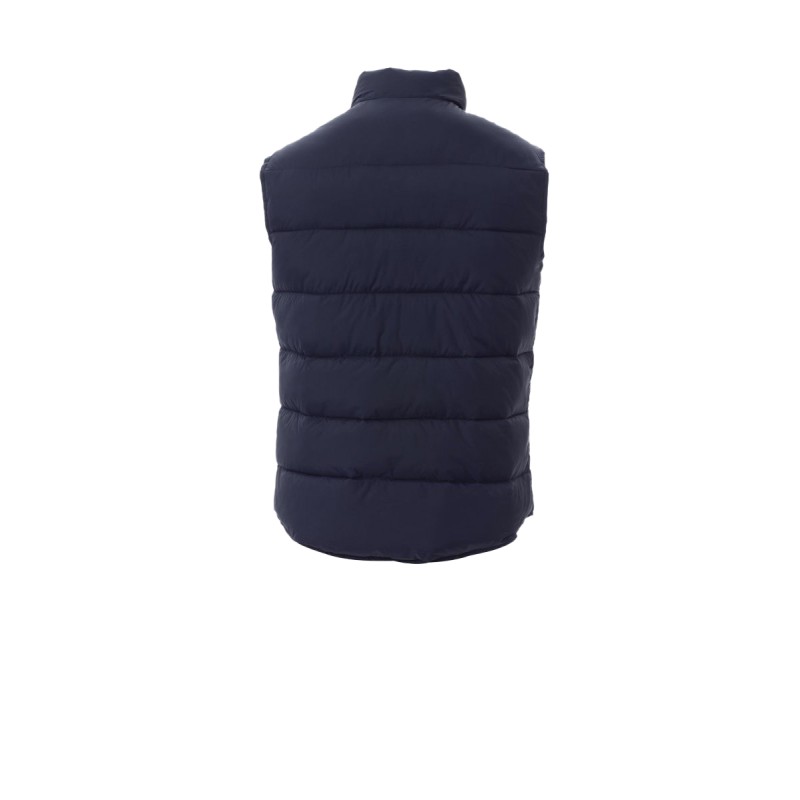 Gilet homme rembourré effet duvet, fermeture éclair en plastique couverte, deux poches extérieures à fermeture éclair couverte, intérieur couleur en contraste.