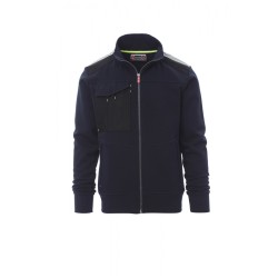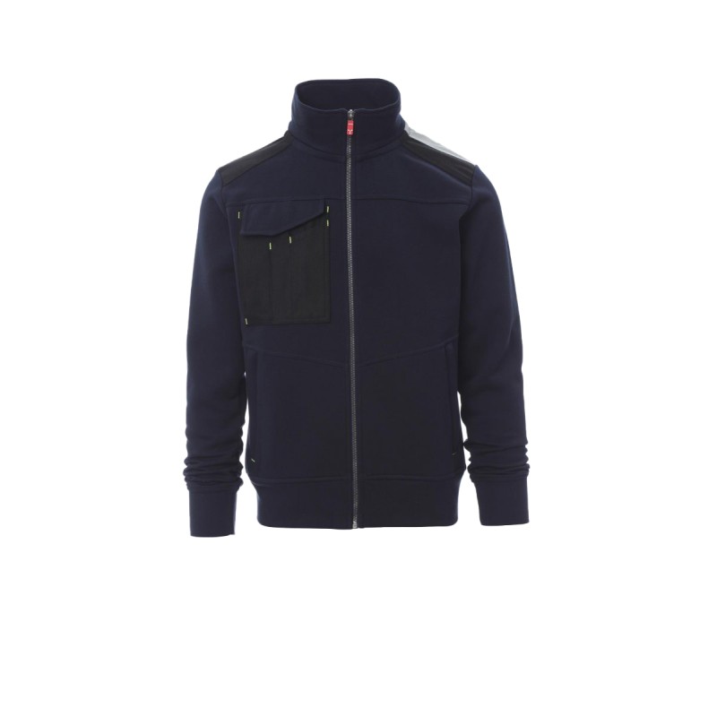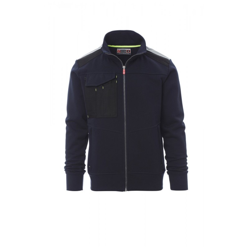 Sweat-shirt pour homme, zip intégral SBS en plastique avec curseur en métal à verrouillage semi-automatique, deux poches avec fermeture éclair, une poche poitrine multifonction avec porte-badge escamotable et rabat de fermeture LOCK SYSTEM, bandes réfléchissantes sur les épaules, poignets et taille en bord côtes élastique, double couture au col, aux manches et à la taille et bande de renfort au col. Traitement hydrofuge du tissu.