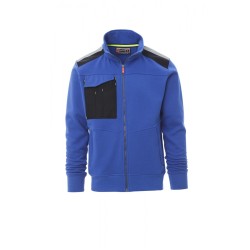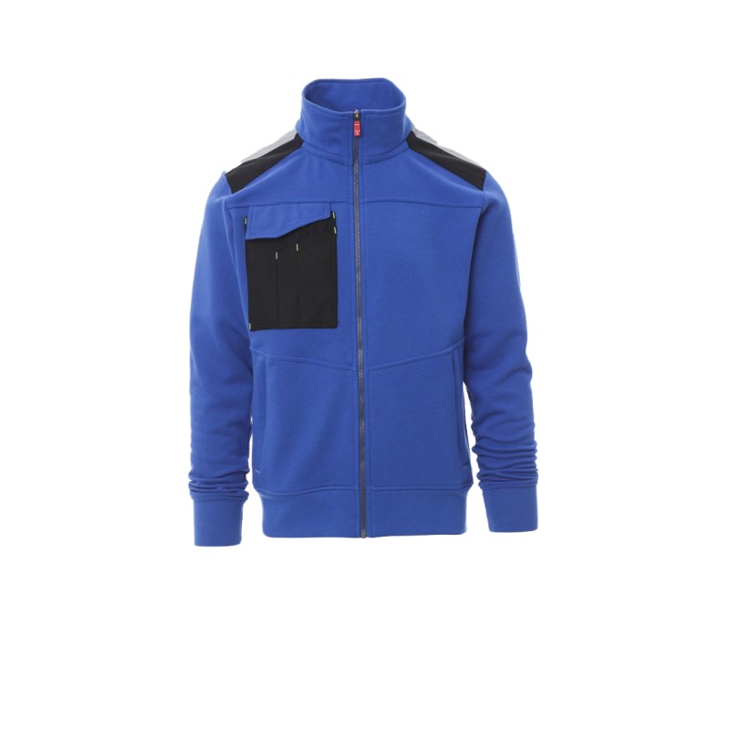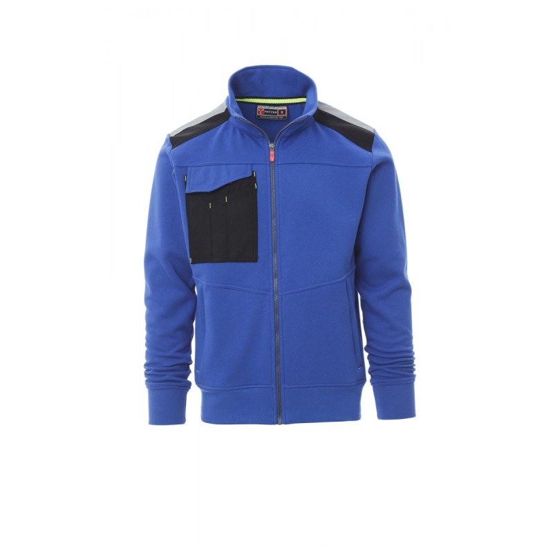 Sweat-shirt pour homme, zip intégral SBS en plastique avec curseur en métal à verrouillage semi-automatique, deux poches avec fermeture éclair, une poche poitrine multifonction avec porte-badge escamotable et rabat de fermeture LOCK SYSTEM, bandes réfléchissantes sur les épaules, poignets et taille en bord côtes élastique, double couture au col, aux manches et à la taille et bande de renfort au col. Traitement hydrofuge du tissu.