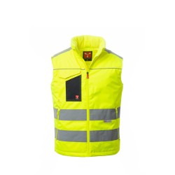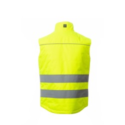 Gilet rembourré unisexe haute visibilité, avec bandes rétroréfléchissantes sur les épaules et le corps. Fermeture avec curseur en métal à verrouillage semi-automatique et tirette personnalisée. Une poche multifonction bicolore sur la poitrine avec anneau porte-badge et rabat de fermeture LOCK SYSTEM. Deux poches extérieures à zip. Col intérieur en fibre polaire. Une poche intérieure avec velcro.