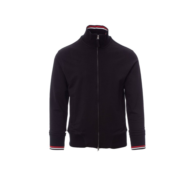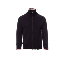 Sweat-shirt homme, fermeture éclair intégrale couverte en plastique avec double curseur easy zip en métal. Taille, col et poignets en bord-côte. Liserés à rayures en contraste, deux poches latérales.