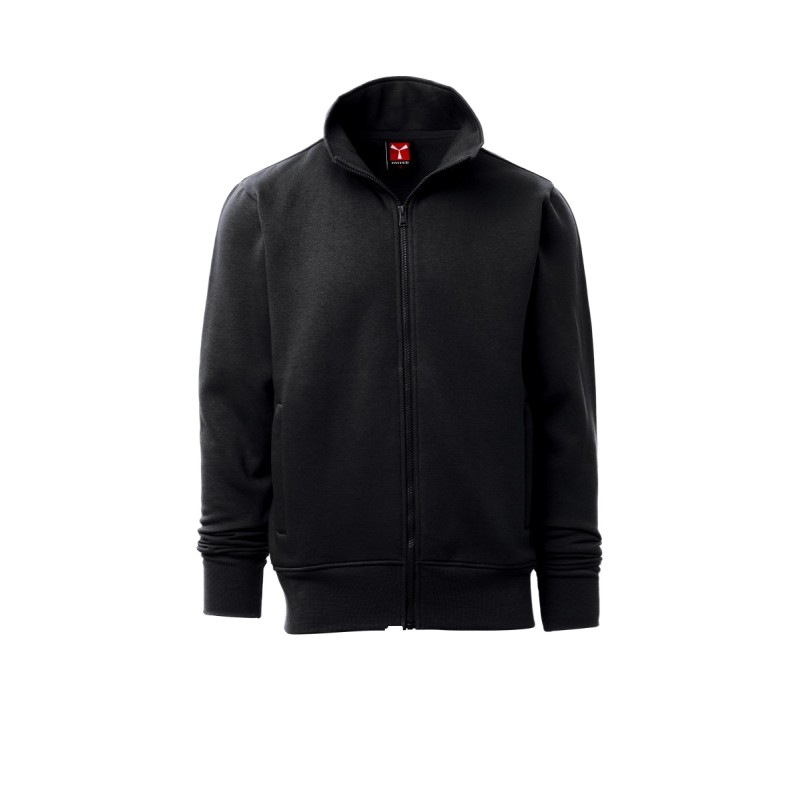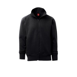 Sweat-shirt pour homme, zip intégral en plastique assorti avec curseur simple personnalisé, manches montées, deux poches passepoilées avec zip, poignets et taille en bord côtes élastique, coutures renforcées, ruban de renfort intérieur col assorti.